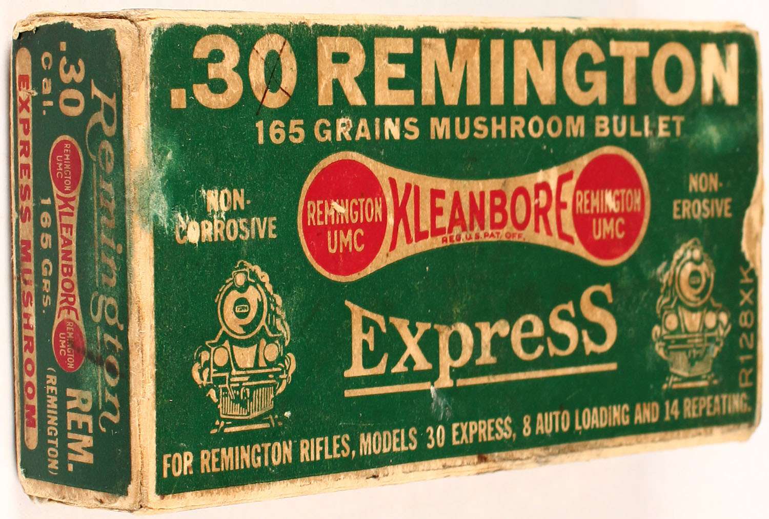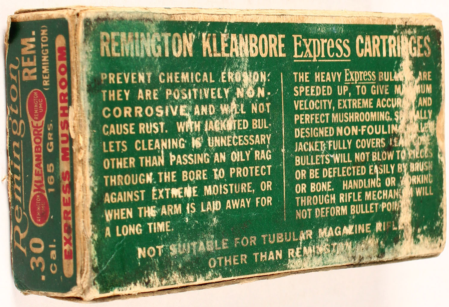 Remington, Kleanbore Express, .30 Remington, 165 Grains Mushroom Bullet, Full, 1pc. Green white & red dog bone/train box, right end flap has been torn & glued to the end of the ammo tray, box has very good color, age soiling, minor shelf wear, some edge & corner wear, top has been written on, left end flap is solid, ammo is excellent. Grade: Very Good + - Value: 50 to 150