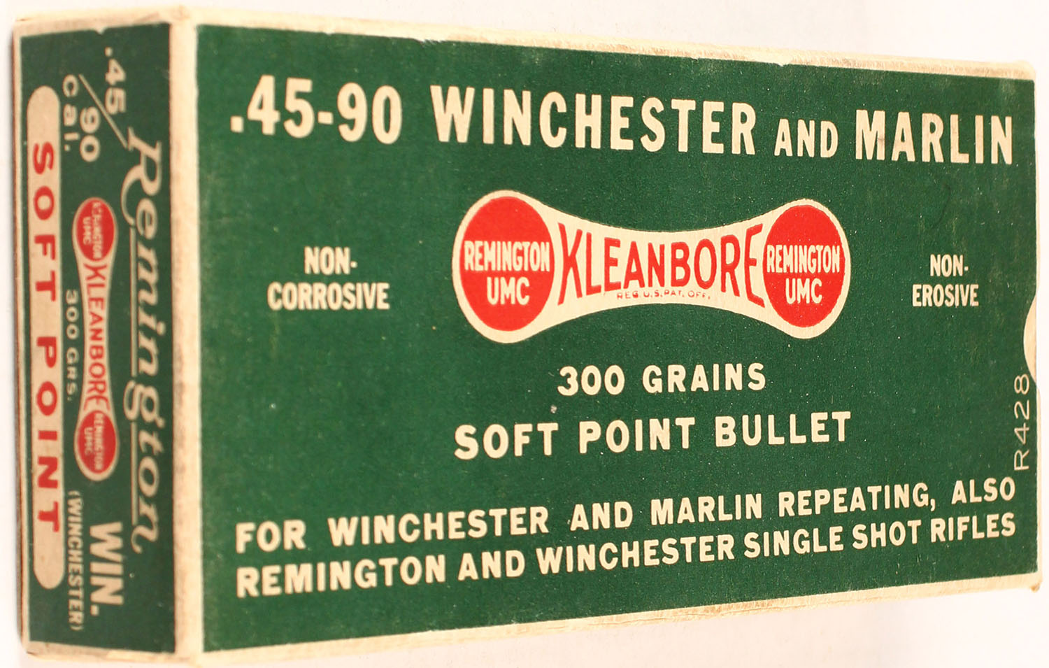 Remington, Kleanbore, .45-90 Winchester and Marlin, 300 Grains Soft Point Bullet, Full, 1pc. Green white & red dog bone box, box is solid with excellent color, very minor age soiling, corners are mostly sharp, edges are crisp, end flaps are solid, ammo is excellent. Grade; Excellent ++ - Value: 100 to 300