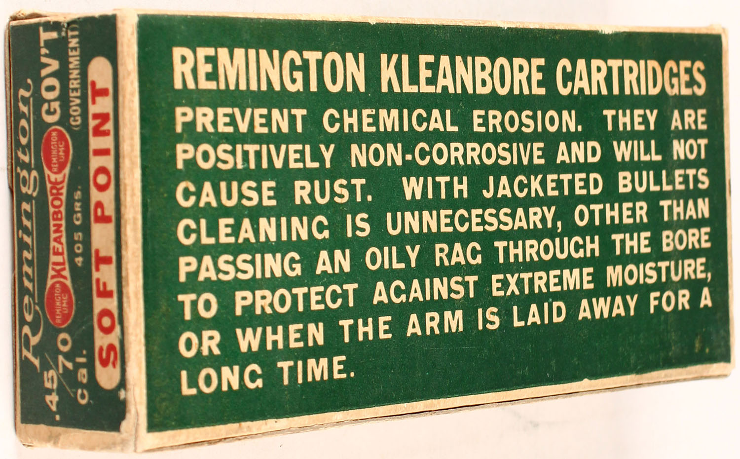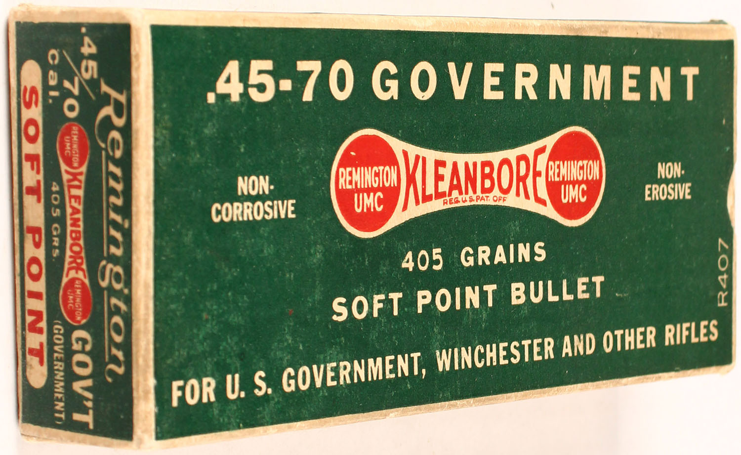 Remington, Kleanbore, .45-70 Government, 405 Grains Soft Point Bullet, Full, 2pc. Green white & red dog bone box, box is solid with excellent color, some age soiling, very minor corner wear, edges are mostly crisp, end flaps are solid, ammo is excellent. Grade: Excellent + - Value: 50 to 150
