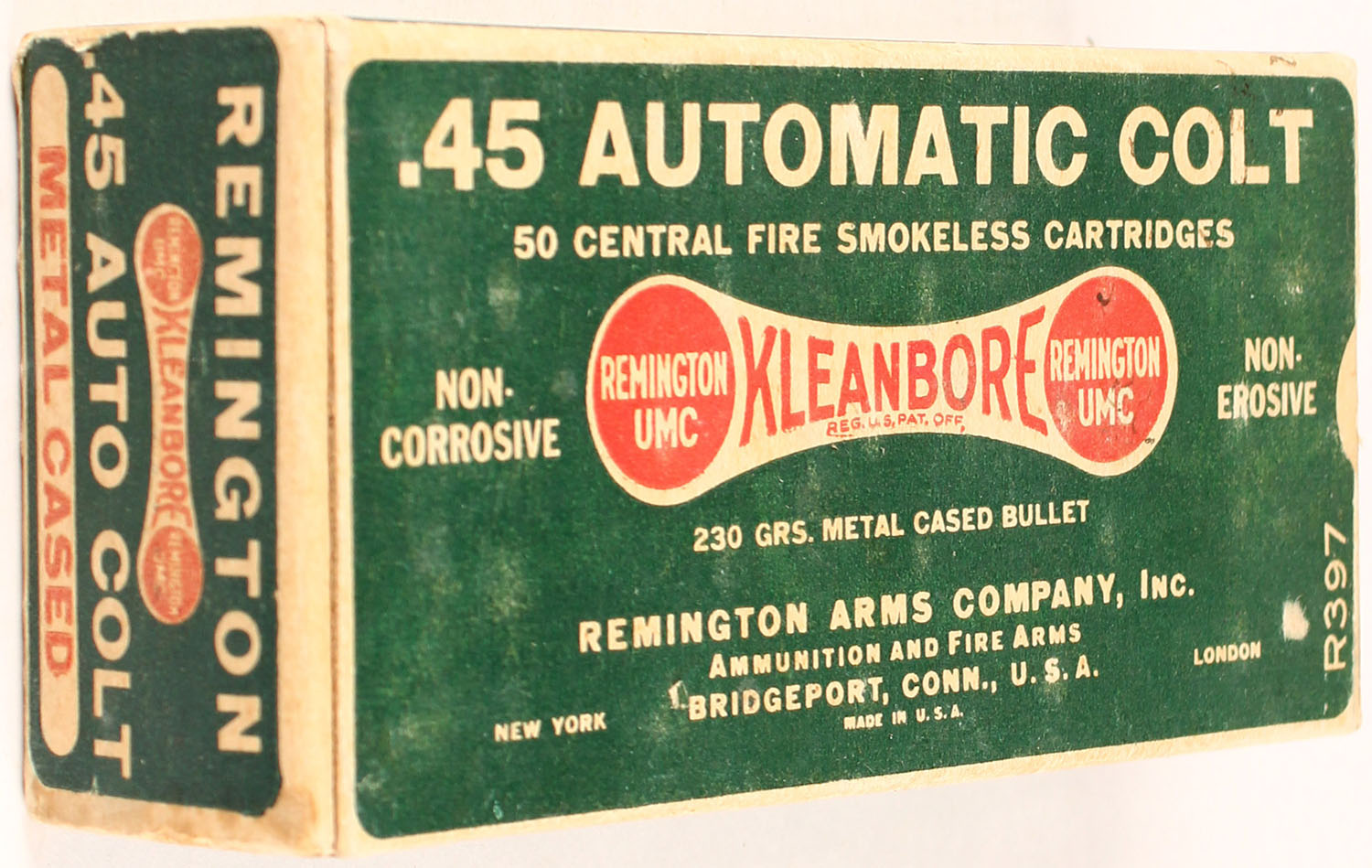 Remington, Kleanbore, .45 Automatic Colt, 230 Grs. Metal Cased Bullet, Full, 1pc. Green white & red dog bone box, box is solid with excellent color, minor age soiling, end flaps are solid, ammo is excellent. Grade: Excellent - Value: 40 to 200