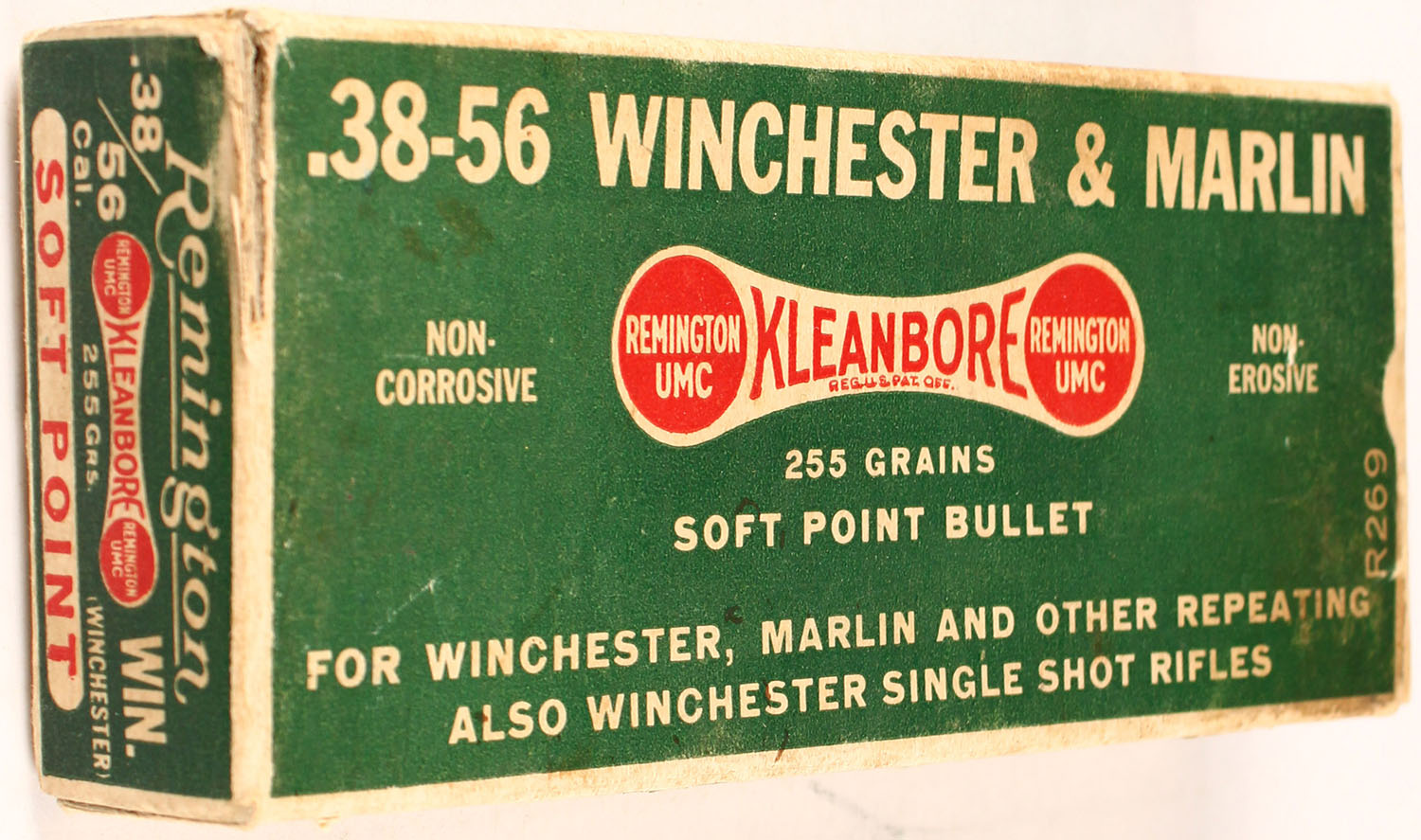 Remington, Kleanbore, .38-56 Winchester & Marlin, 255 Grs. Soft Point Bullet, Full, 1pc. Green white & red dog bone box, box is solid with excellent color, minor age soiling, end flaps are solid, ammo is excellent. Grade: Excellent - Value: 40 to 200