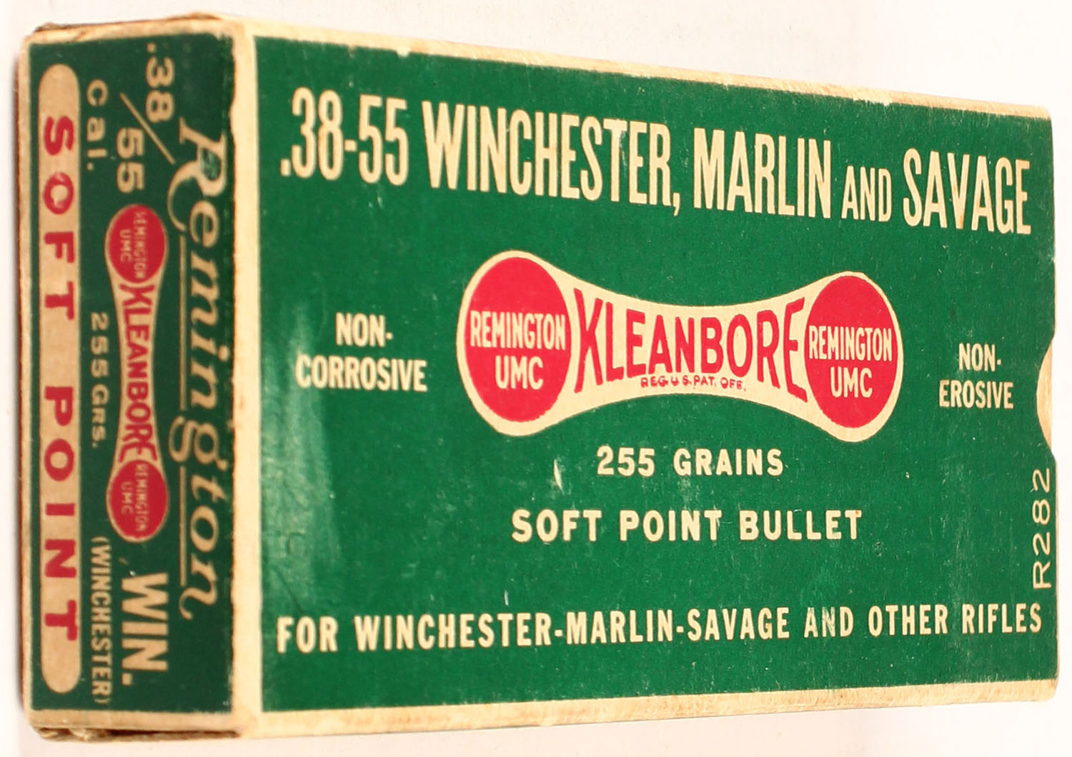 Remington Kleanbore, .38-55, 255 Gr. Soft Point Bullet, 1pc, Full, buff box with green label & white/red print, box is solid with light rub wear, ammo ranges from excellent to very good. Grade: Excellent + - Value: 40 to 150