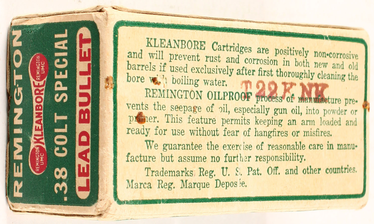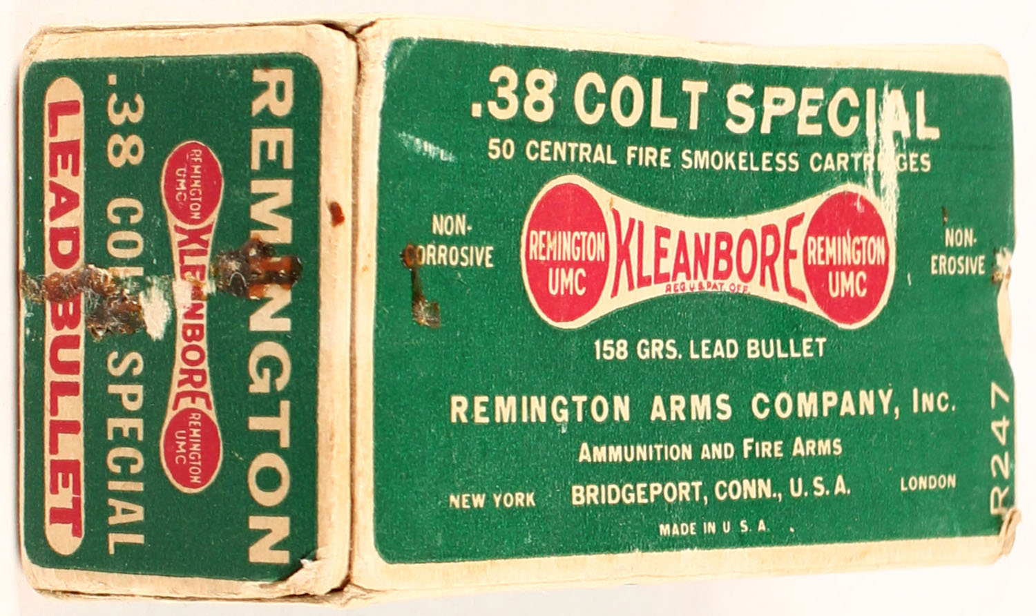 Remington Kleanbore, .38 Colt Special, 158 Gr. Lead Bullet, 1pc, Full, buff box with green label & white/red print, box is solid with light rub wear, ammo is excellent. Grade: Excellent - Value: 30 to 100