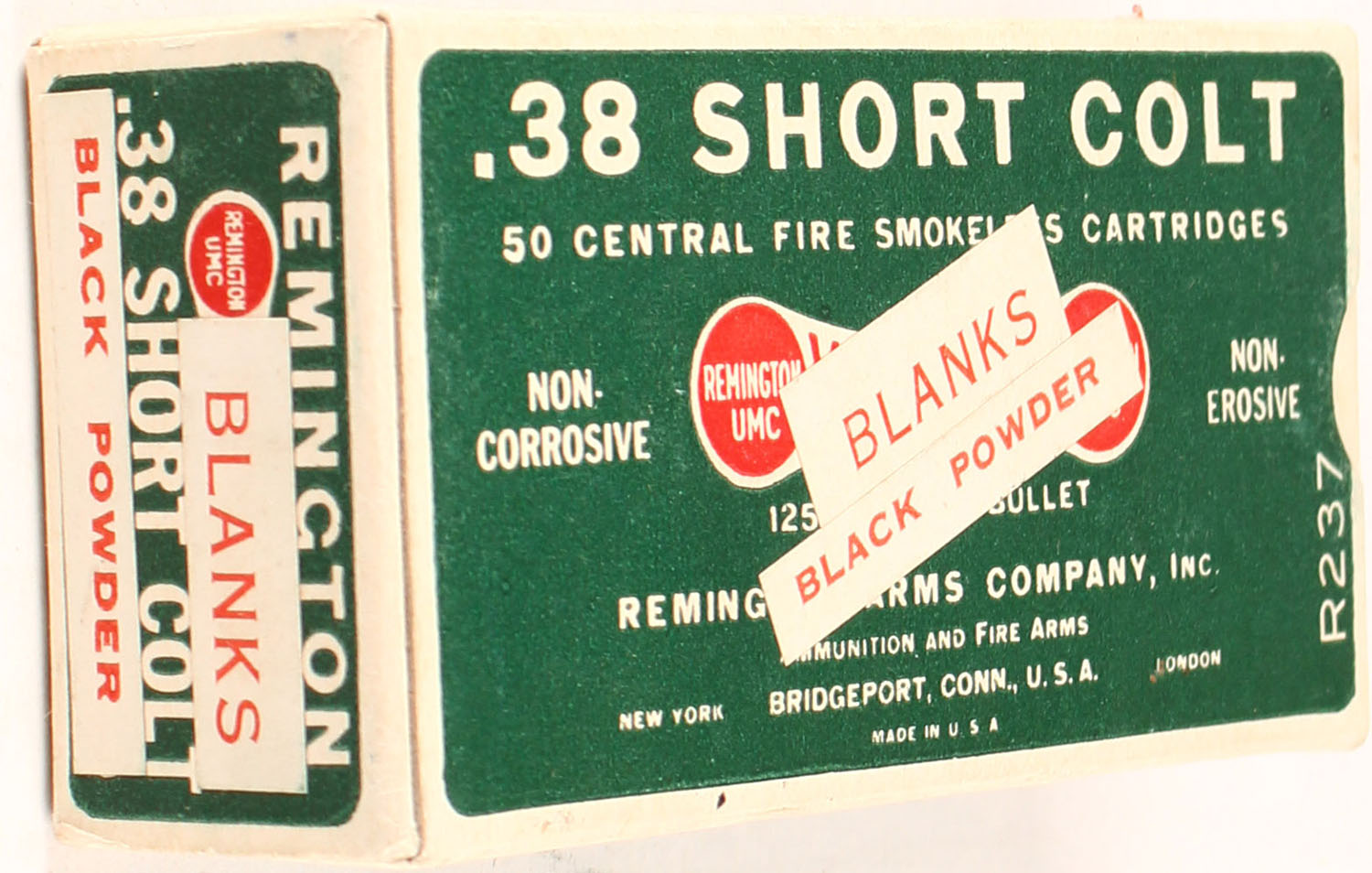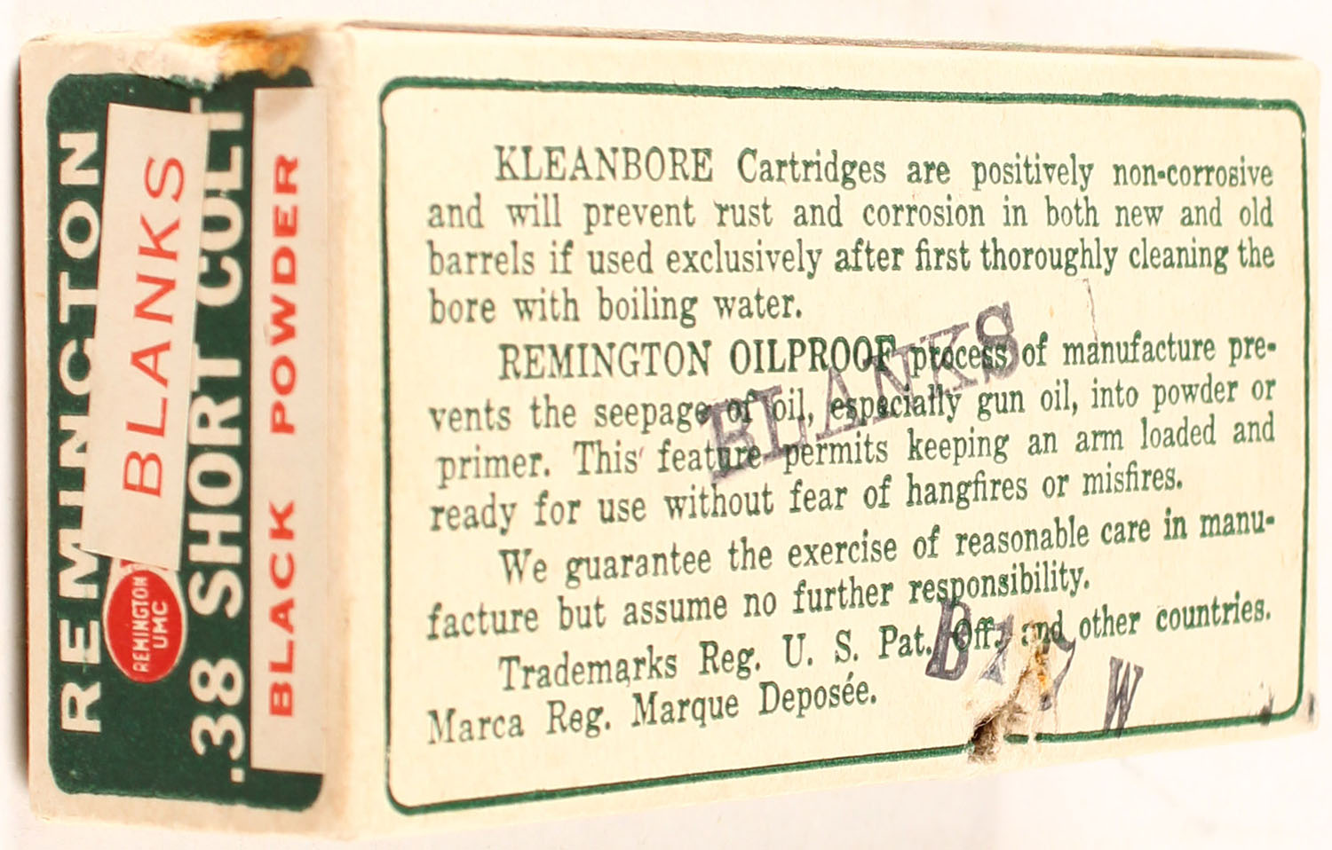 Remington Kleanbore, .38 Short Colt, OVER LABELS ''BLANKS BLACK POWDER'', 1pc, full, buff box with green label & red/white print, box is MINT, ammo is excellent. Grade: mint - Value: 30 to 150