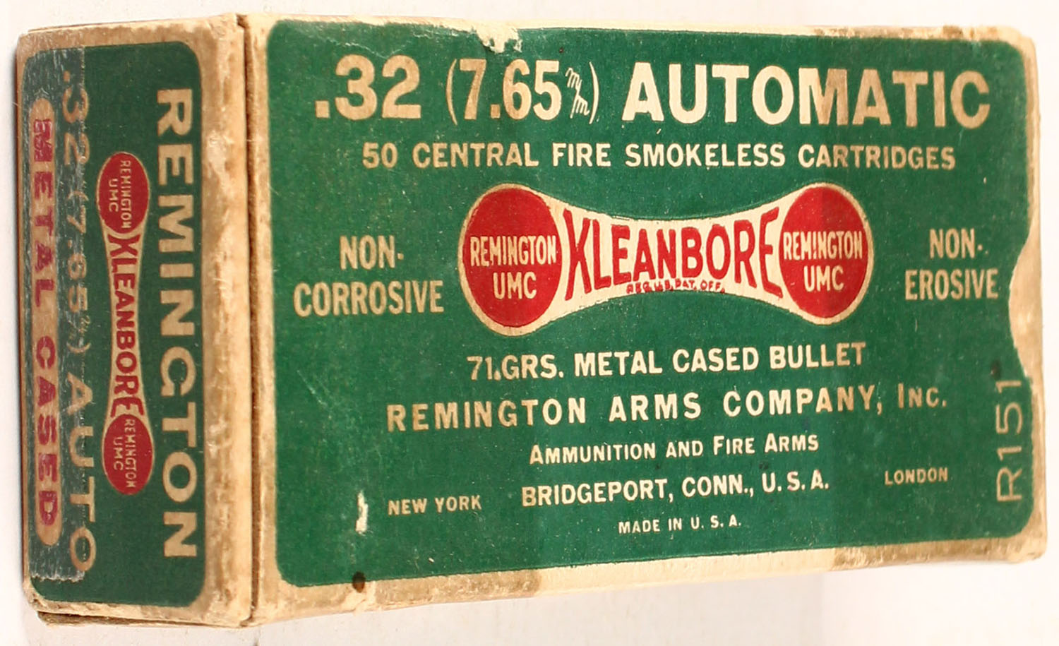 Remington Kleanbore, .32 (7.62) Automatic, 71 Gr. Metal Cased Bullet, 1pc, Full, buff box with green label & white/red print, box has one loose end flap, you can see the age soiling on both side & clean where the over label used to be, ammo is excellent. Grade: Very Good ++ - Value: 20 to 60