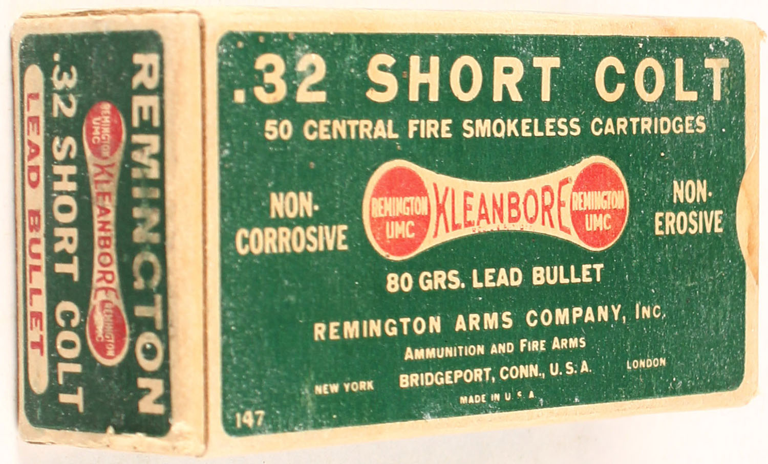 Remington, Kleanbore, .32 Short Colt, 80 Grain Lead Bullet, Full, 1pc. Green red & white box, box is solid with excellent color, end flaps are solid, ammo is nice with oxidation to the lead. Grade: Excellent - Value: 20 to 100