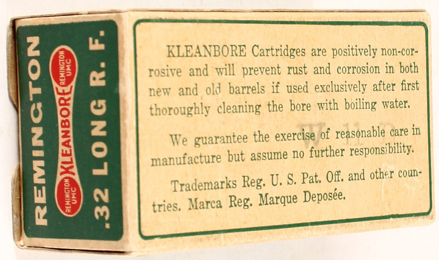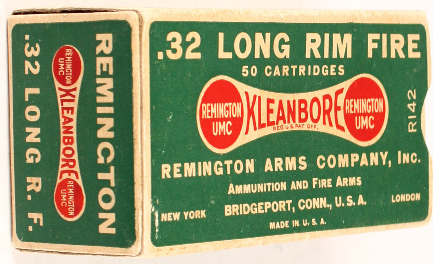 Remington, Kleanbore, .32 LONG RIM FIRE, Full, 1pc. Green red & white box, box is solid with excellent color, end flaps are solid, ammo is excellent with oxidation to the lead. Grade: Excellent + - Value: 30 to 200