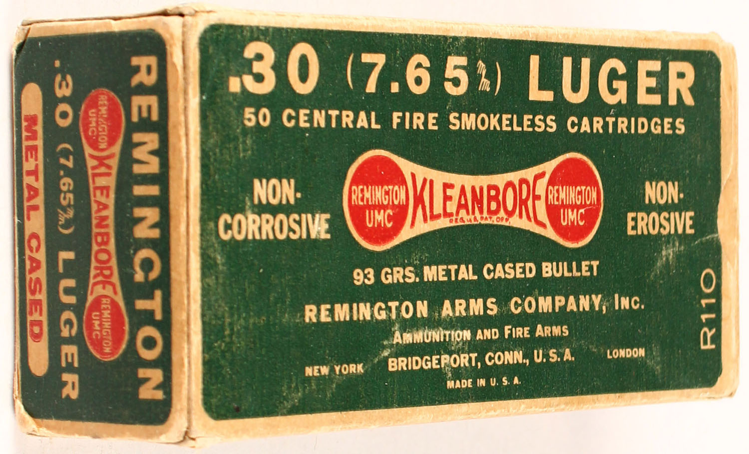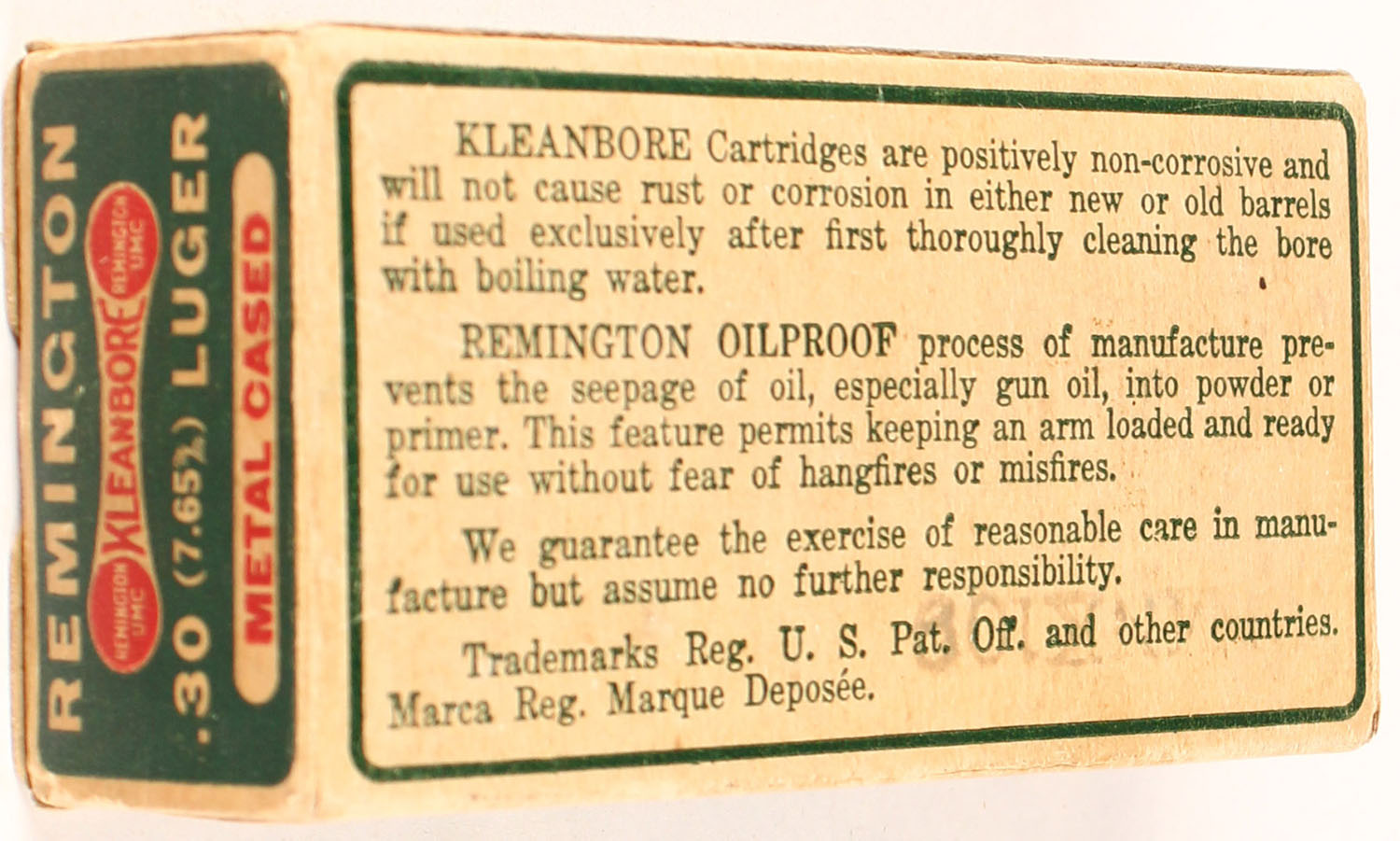 Remington, Kleanbore, .30 (7.65) LUGER, 93 Grain Metal Cased Bullet, Full, 1pc. Green red & white box, box is solid with excellent color, end flaps are solid, ammo is excellent. Grade: Excellent - Value: 30 to 100