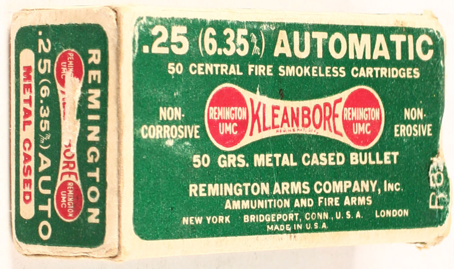 Remington, Kleanbore, .25 (6.35m/m) Automatic, 50 Grain Metal cased Bullet, Partial 40rds., 1pc. Green red & white box, box has one loose flap with excellent color, ammo is excellent. Grade: Very Good ++ - Value: 10 to 60