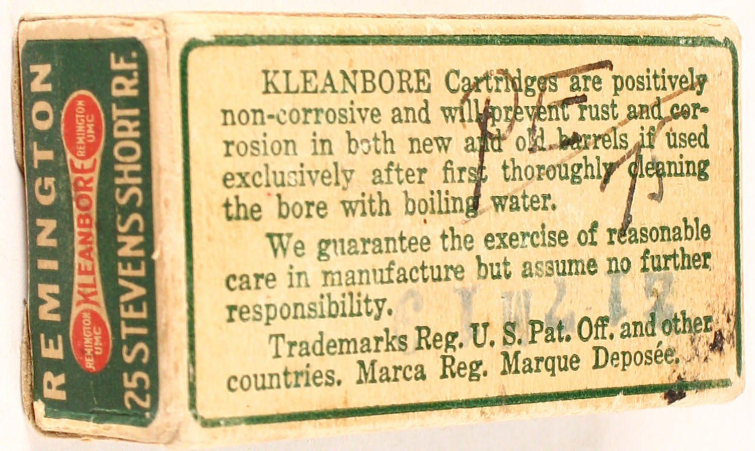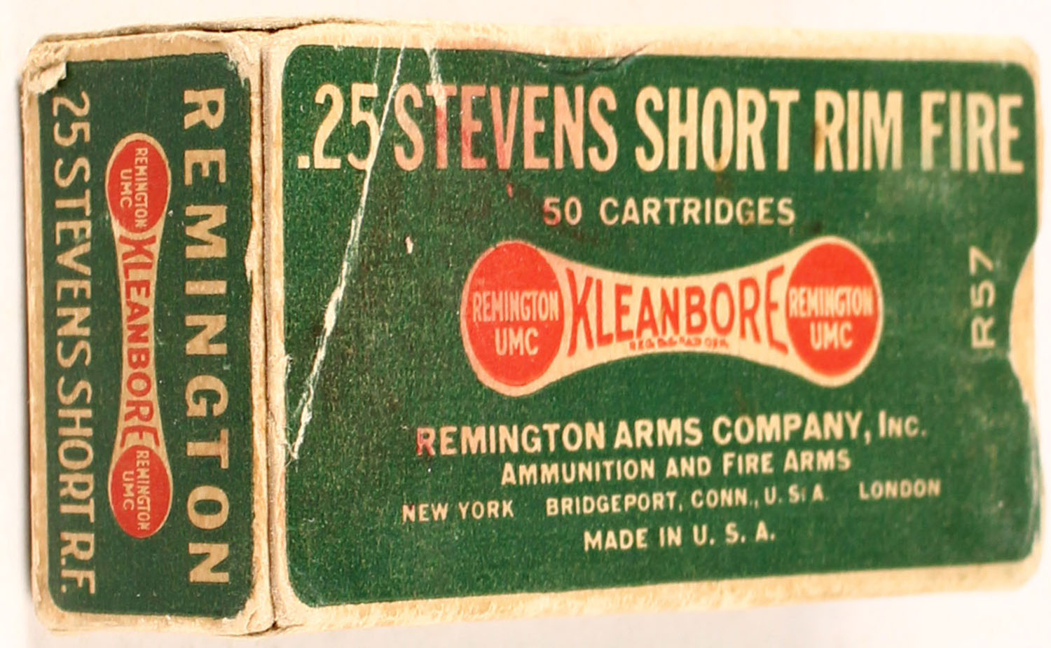 Remington, Kleanbore, .25 Stevens Short Rim Fire, Full., 1pc. Green red & white box, box is solid with some soiling, end flaps are ok, ammo is excellent. Grade: Very Good ++ - Value: 20 to 200