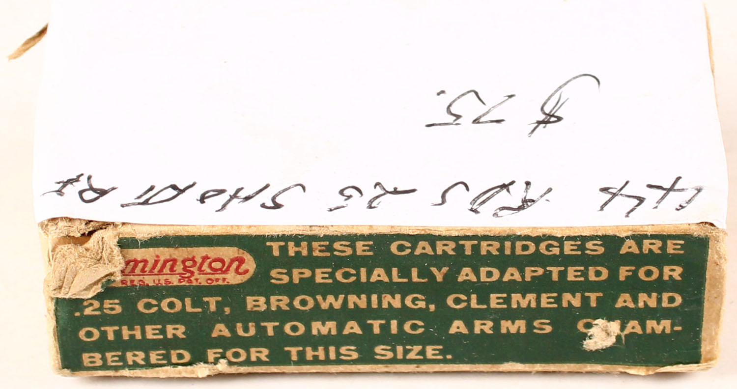 Remington, Kleanbore, .25 Stevens Short Rim Fire, Partial 44rds., 1pc. Green red & white box, box has sticker covering top of box with no end flaps, so ammo only ammo is excellent. AMMO is Grade: Excellent - Value: 20 to 100