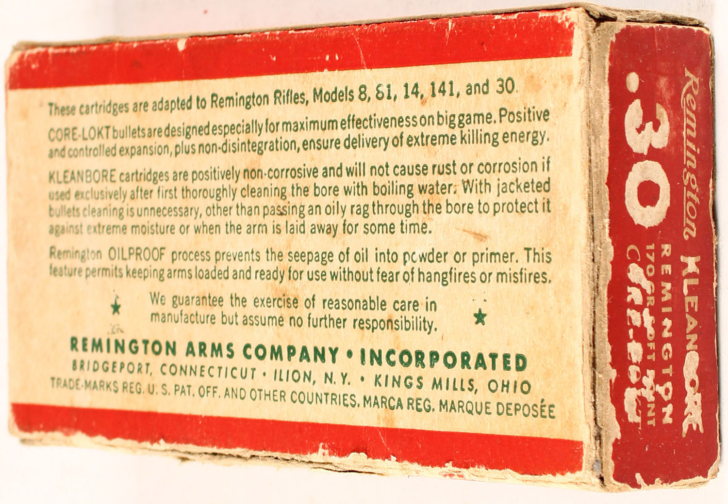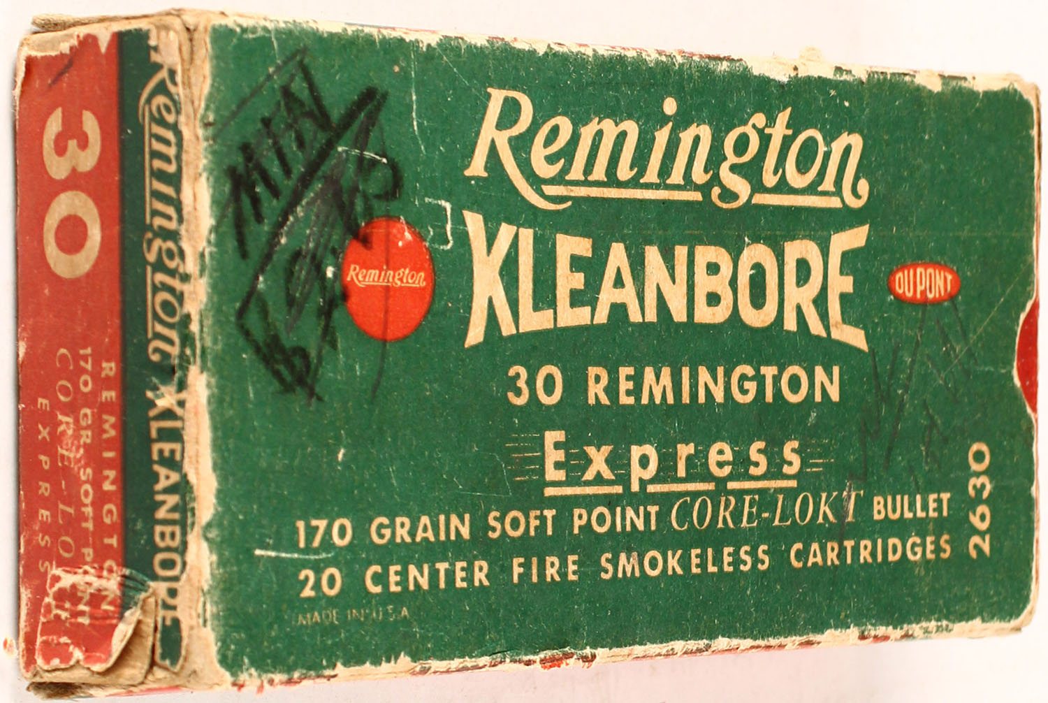 Remington, Kleanbore Express, .30 Remington, 170 Grain Soft Point Bullet, Full, 1pc. Green red & white box, box shows edge wear with some light age soiling, ammo is mint. Grade: Very Good + - Value: 20 to 50