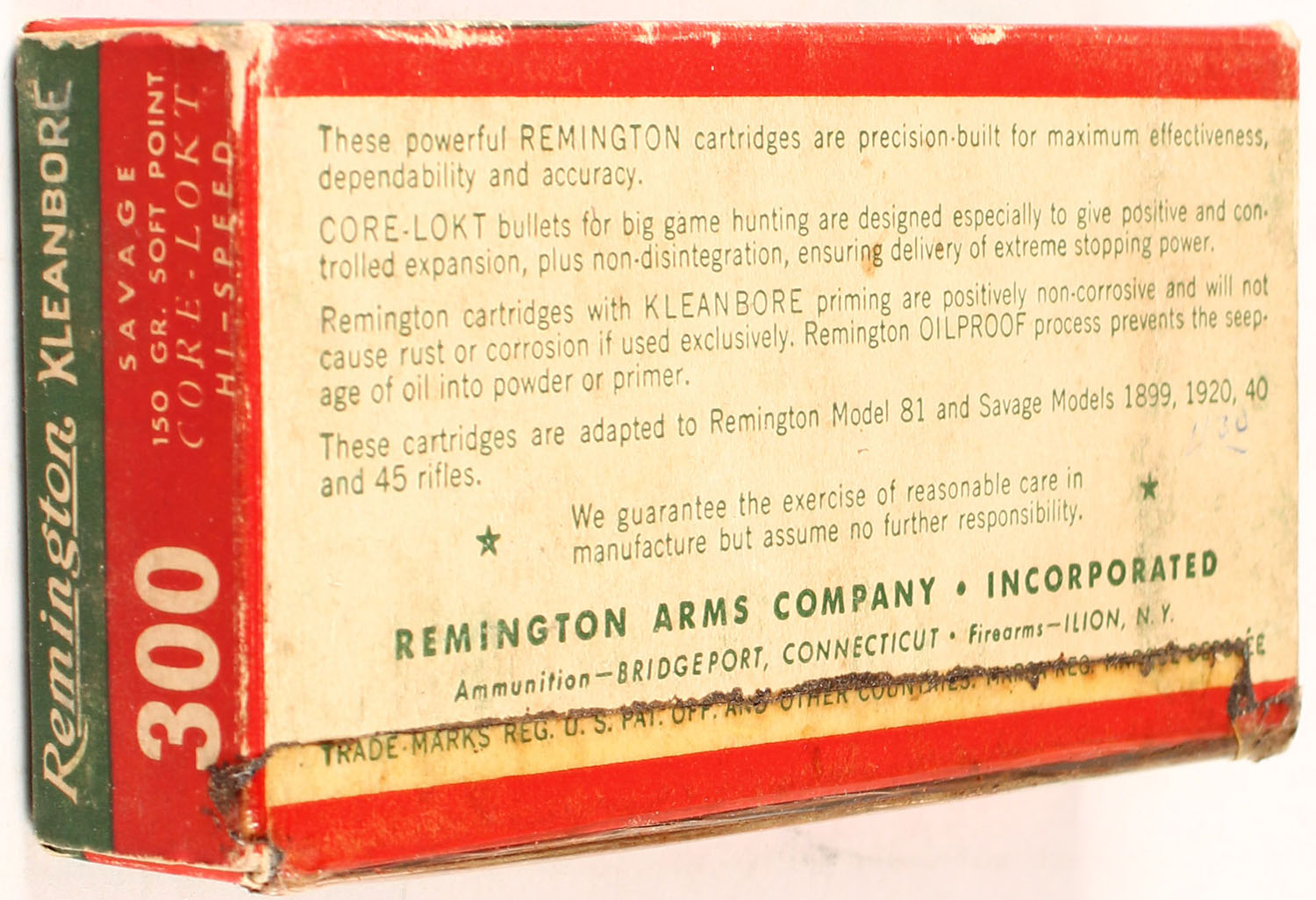Remington, Kleanbore Hi-Speed, 300 Savage, 150 Grain Soft Point Bullet, Full, 1pc. Green red & white box, box is solid with excellent color, one tape repair, very minor age soiling, end flaps are solid, ammo is excellent. Grade: Very Good ++ - Value: 20 to 100