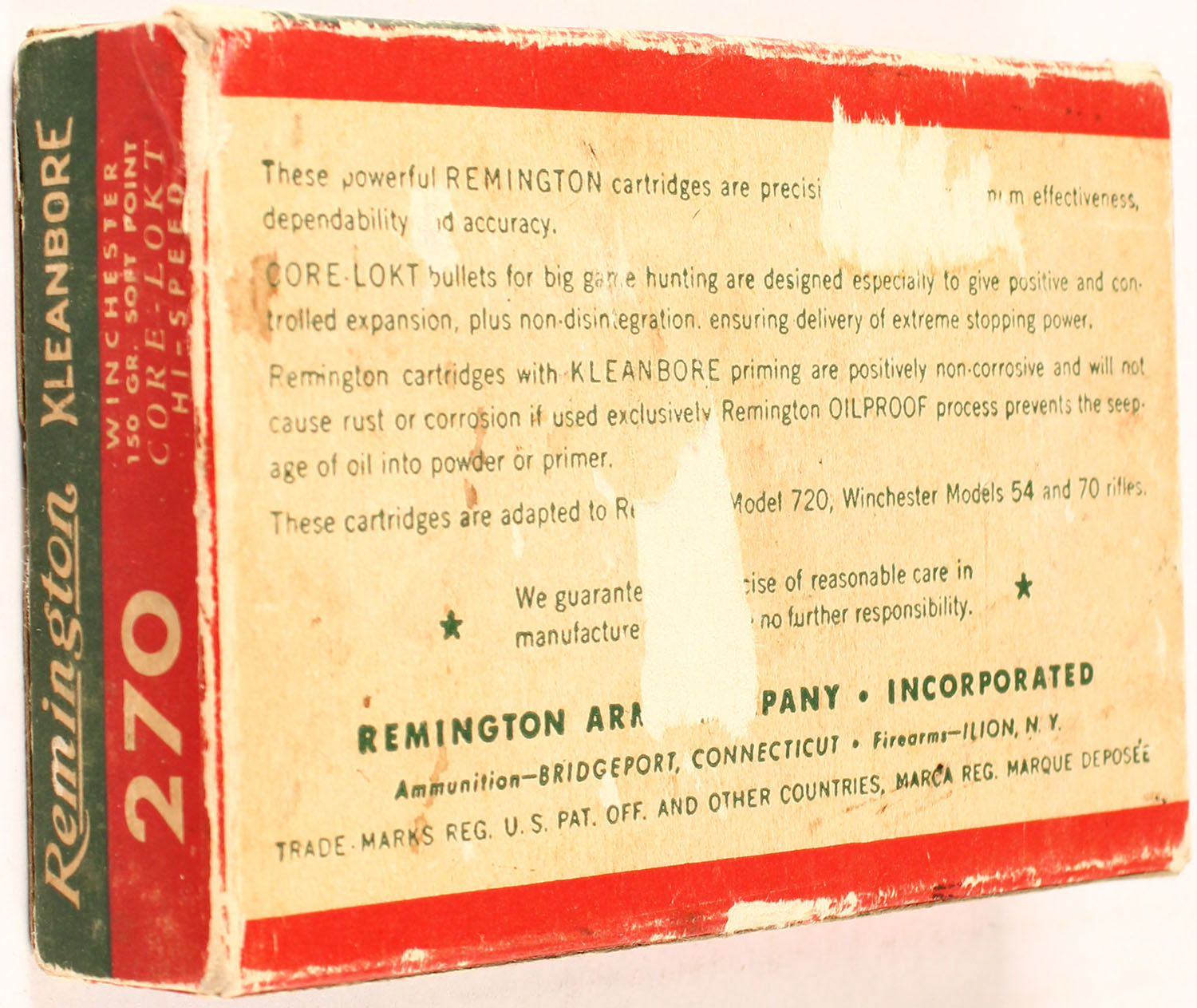 Remington, Kleanbore Hi-Speed, .270 Winchester, 150 Grain Soft Point Bullet, Full, 1pc. Green red & white box, box is solid with edge wear & a small hole on front, ammo is excellent. Grade: Very Good + - Value: 20 to 90