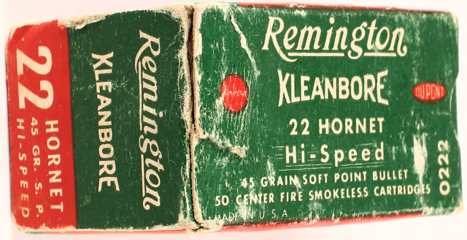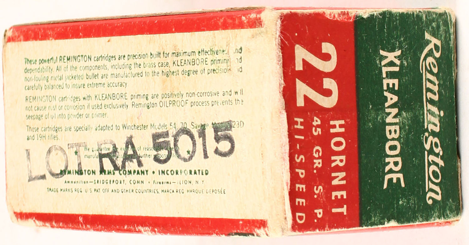 Remington, Kleanbore Hi-Speed, 22 Hornet, 45 Grain Soft Point Bullet, Full, 1pc. Green red & white box, box has a tear to top with nice color, end flaps are solid, ammo is excellent. Grade: Very Good - Value: 20 to 100