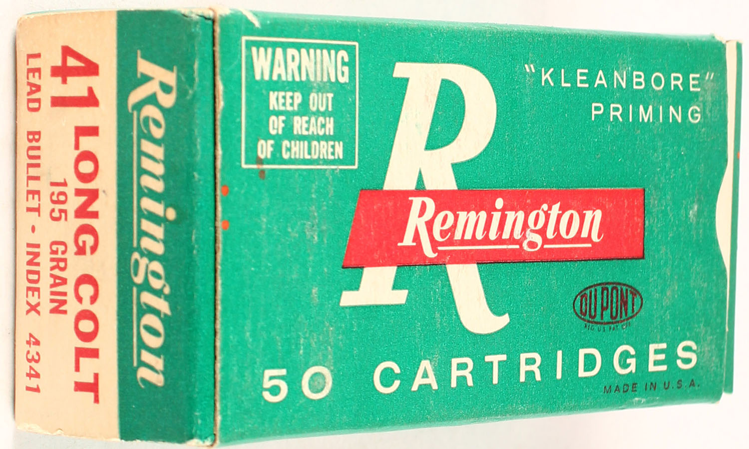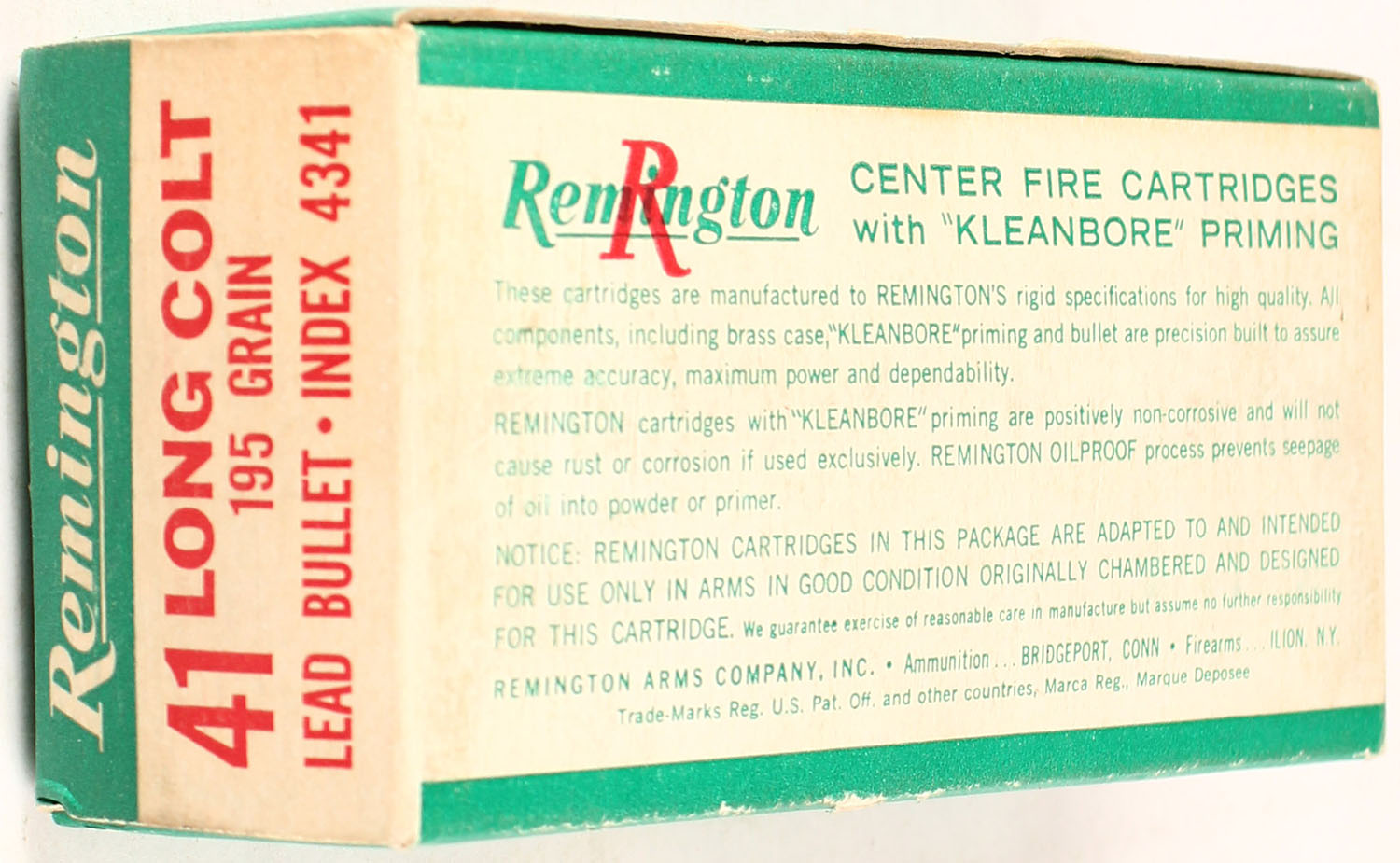 Remington, .41 Long Colt, 195 Gr. Lead Bullet, 1pc, Full, green box with red/white print, box is solid with great colors, ammo is mint. Grade: Excellent ++ - Value: 30 to 150