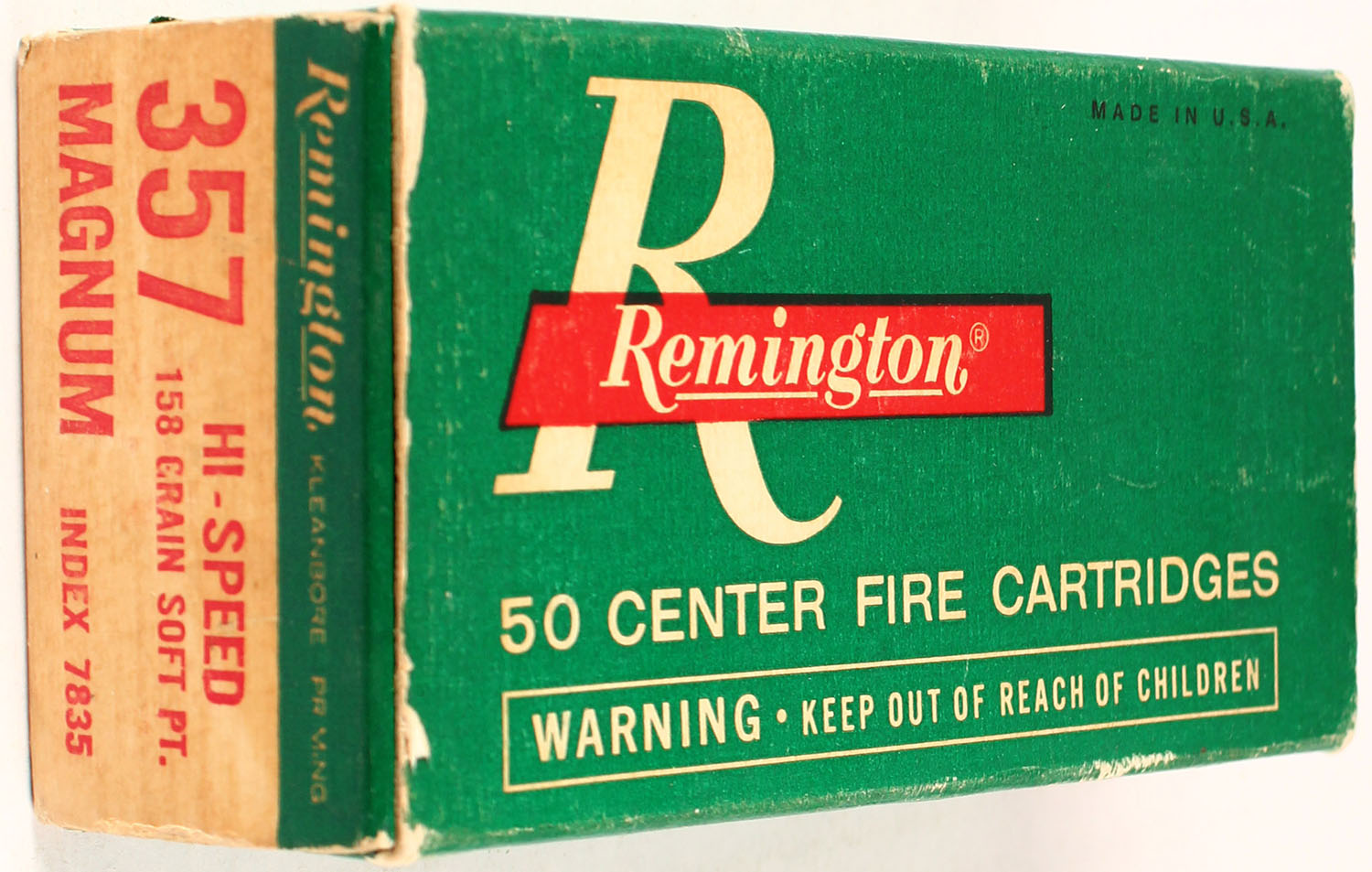 Remington, .357 Mangum, 158 Gr. Soft Point, 1pc, Full, green box with red/white print, box is solid with great colors, ammo is mint. Grade: Excellent + - Value: 20 to 60