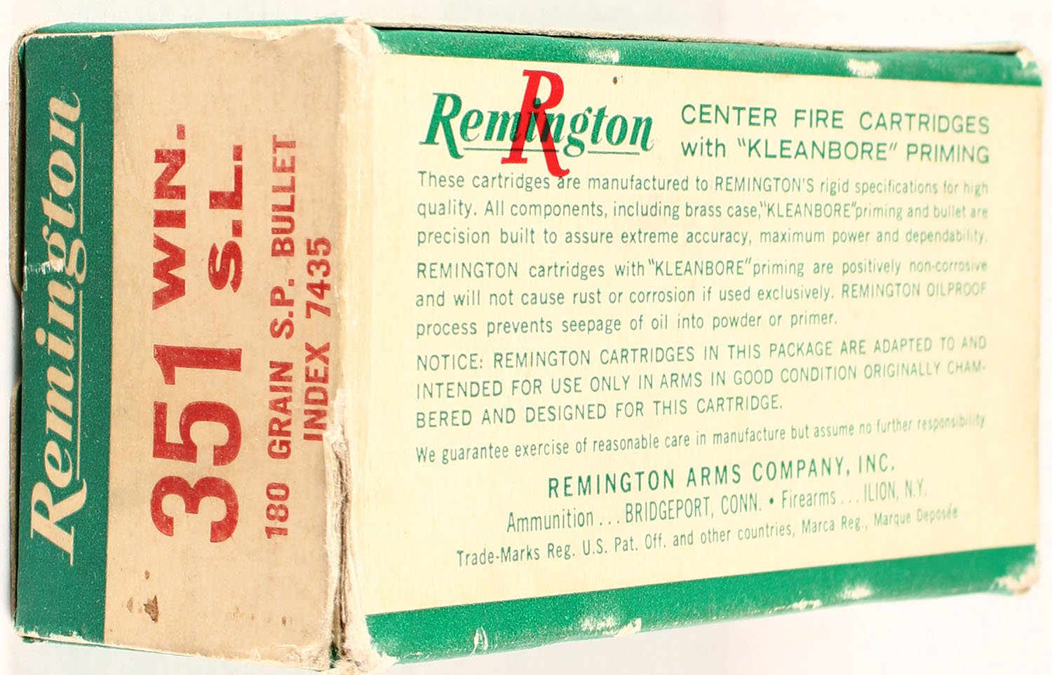 Remington, .351 WIN. S.L., 180 Gr. Soft Point, 1pc, Full, green box with red/white print, box is solid with nice colors, ammo is mint. Grade: Excellent + - Value: 30 to 150