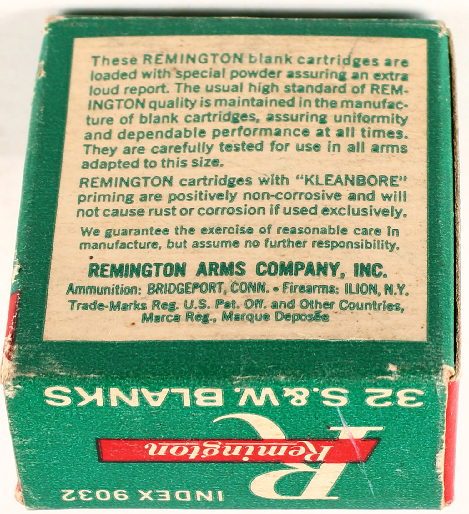 Remington, .32 S&W Blanks, Extra Loud Report, 1pc, 90% Full, green box with red/white print, box is solid with nice colors, ammo is excellent. Grade: Excellent + - Value: 10 to 50