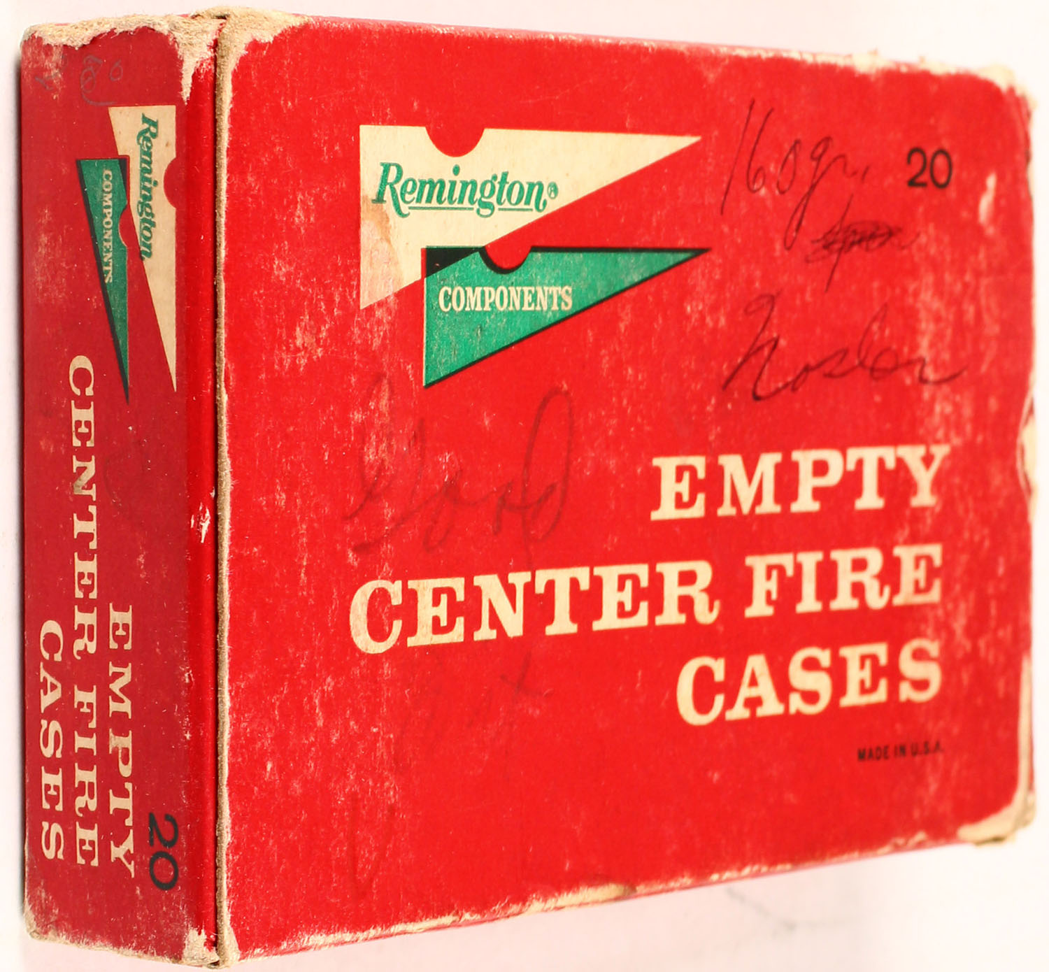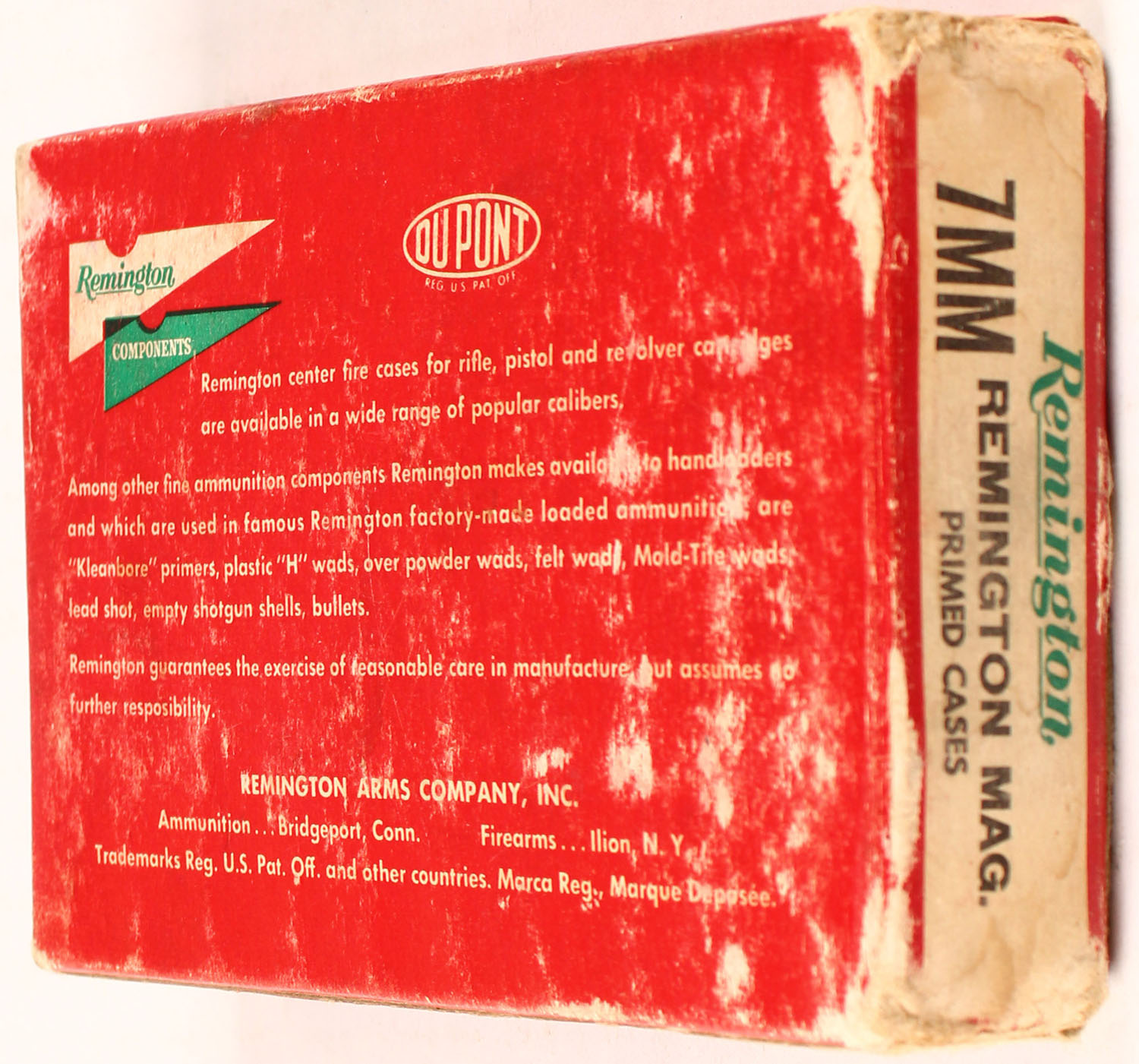 Remington, .7mm Remington Mag Primed Cases, all of them have been loaded, 1pc, Full, red box, box shows edge wear & writing, ammo is very good. Grade: Very Good ++ - Value: 2 to 30