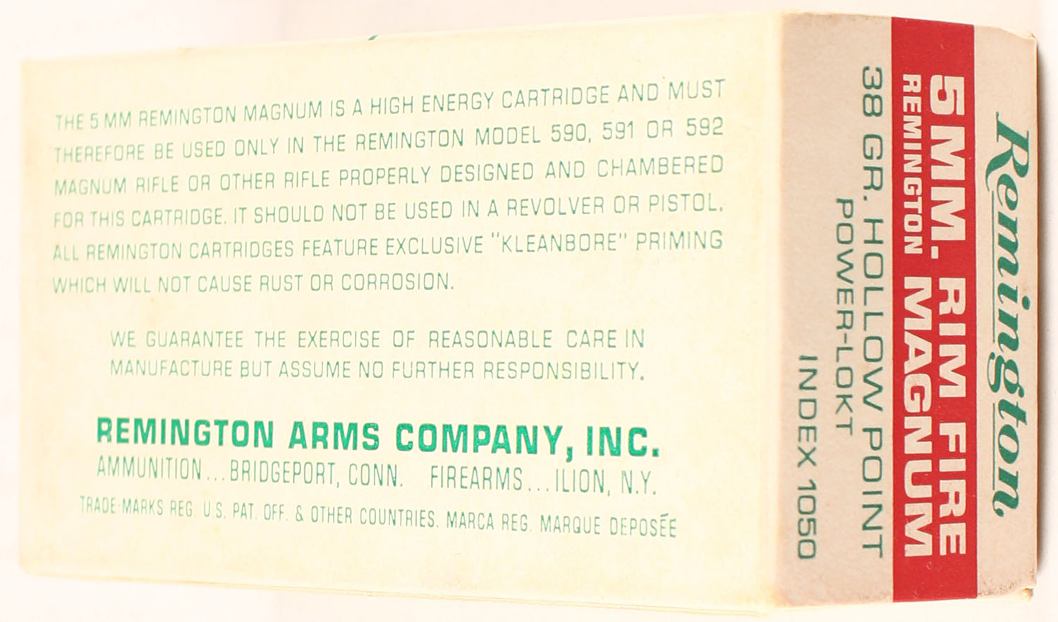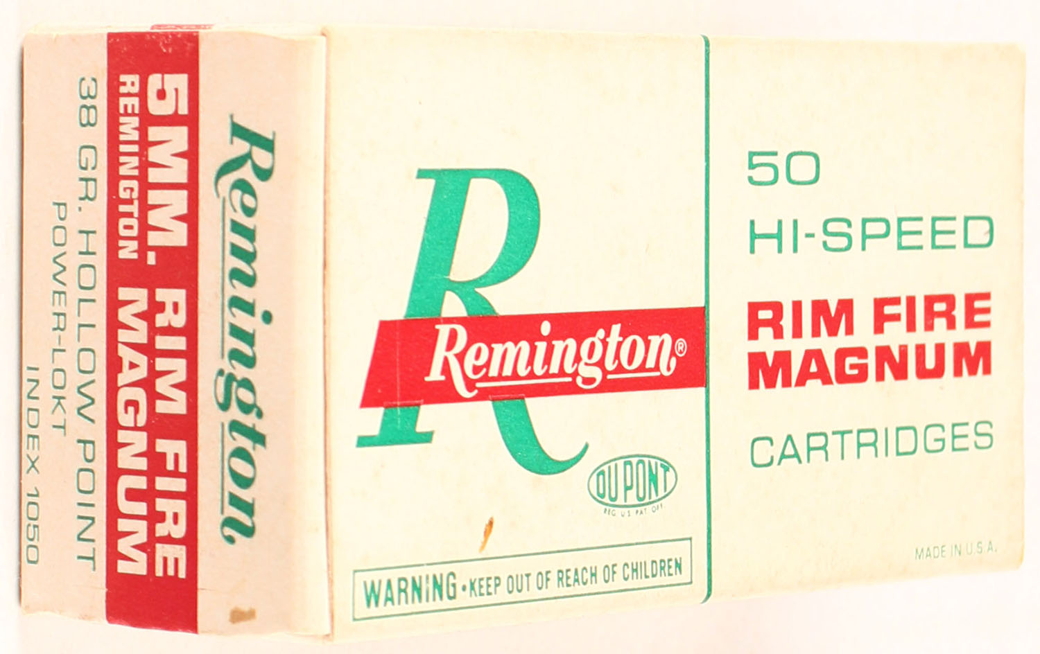 Remington Hi-Speed, Rim Fire, 5mm MAG., Hollow Point, 1pc, Full, 1050, 38 Grain. HP Power-Lokt, green, red & white box, solid box, ammo is excellent. Grade: Excellent ++ - Value: 30 to 100