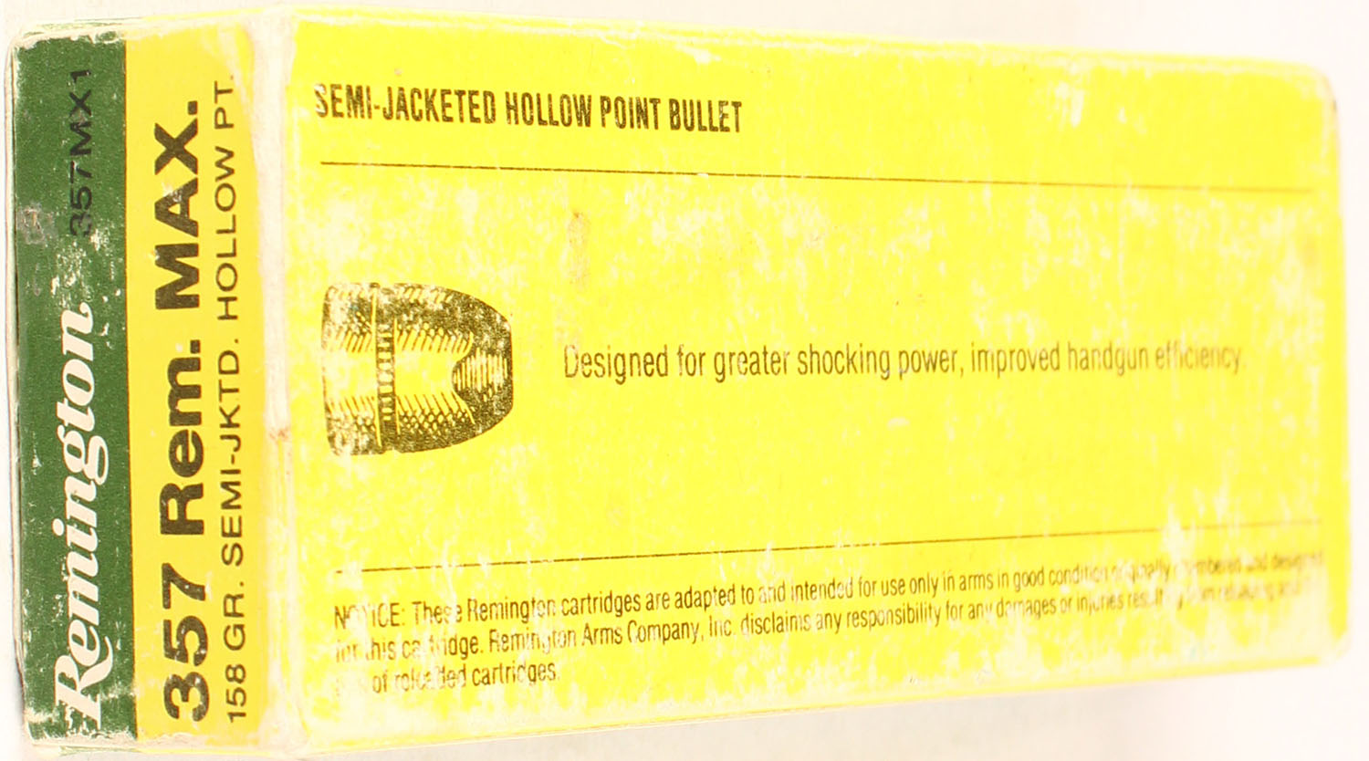 Remington 357 REM MAX, 158 Gr Semi JKTD Hollow Pt, 1pc, Full, green, yellow box, box shows edge wear, ammo is excellent. Grade: Very Good ++ - Value: 16 to 50