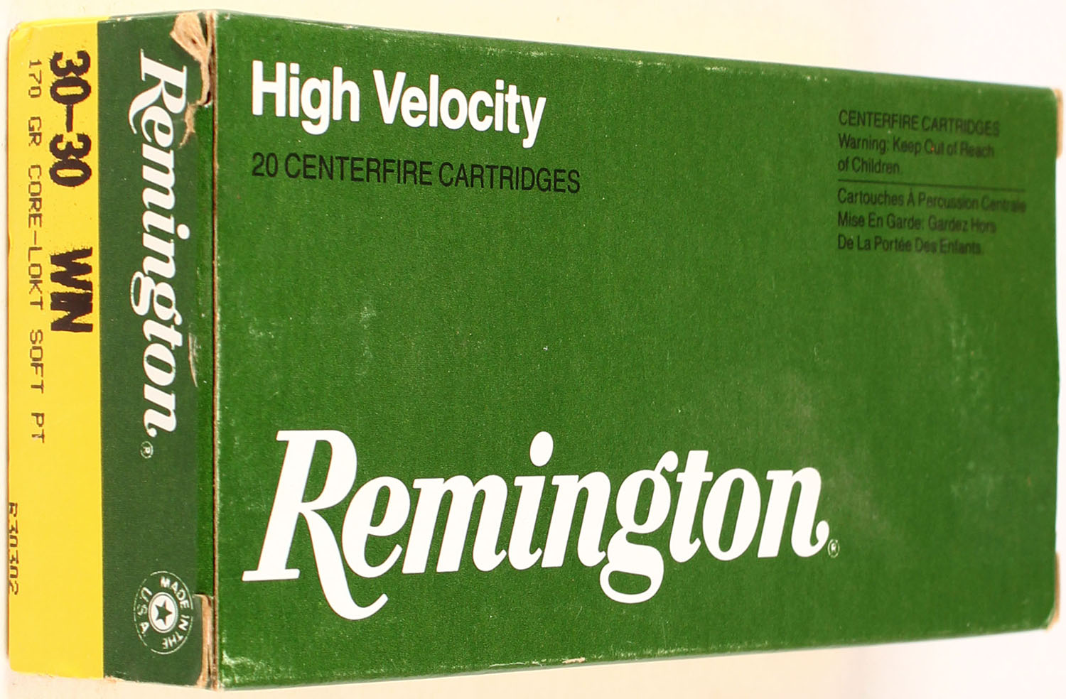 Remington, .30-30 Win., High Velocity, 170 Gr. Core-Lokt Soft PT, 1pc, Full, green/yellow box with black/white print, box is solid with light handling wear & light rub wear, ammo is excellent. Grade: Excellent ++ - Value: 30 to 90