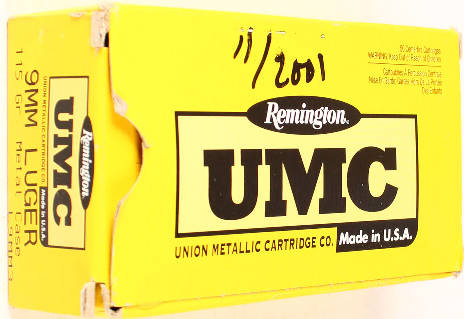 UMC, 9mm Luger, 1pc., Full, 115 Gr Metal Case, box & ammo are mint. Grade: MINT - Value: 10 to 50