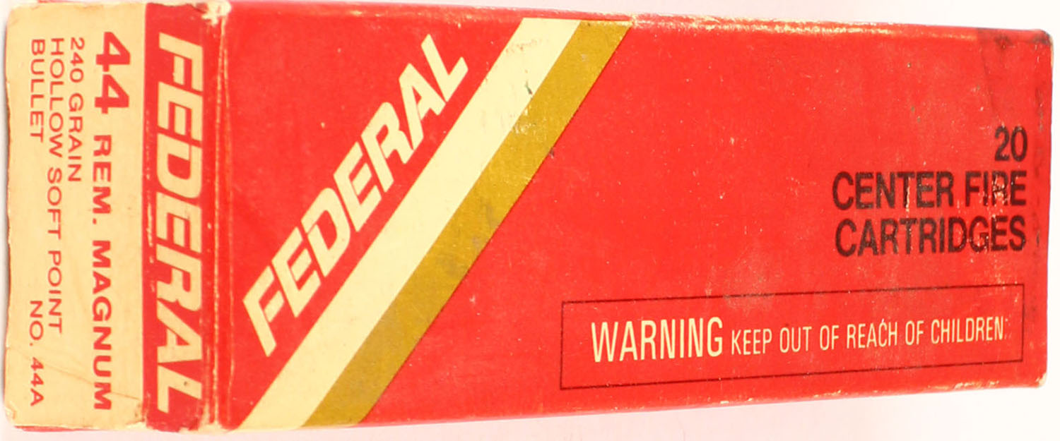 Federal, 44 Rem. Magnum, 1pc., Full, 240 Gr. Hollow Soft Point Bullet, No. 44A, box is solid, ammo is excellent. Grade: Excellent - Value: 20 to 80