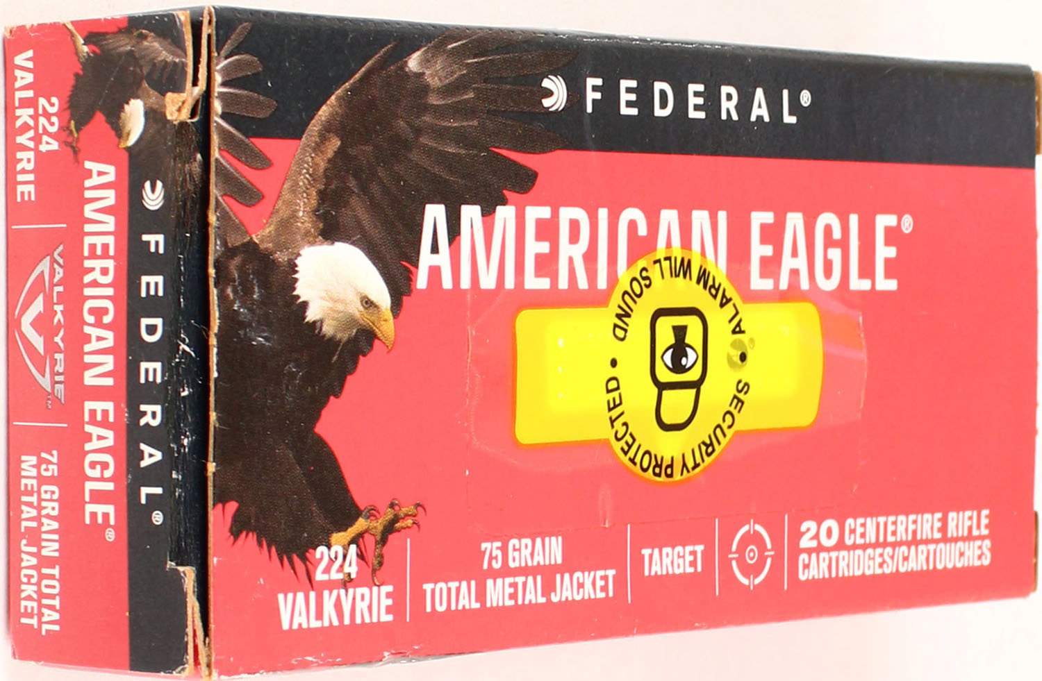 Federal, American Eagle, 224 Valkyrie Total Metal Jacket, 75 Grain, Full, 1pc. multi-colored box, box is solid with excellent color, Ammo is excellent. Grade: Excellent ++ - Value: 20 to 80