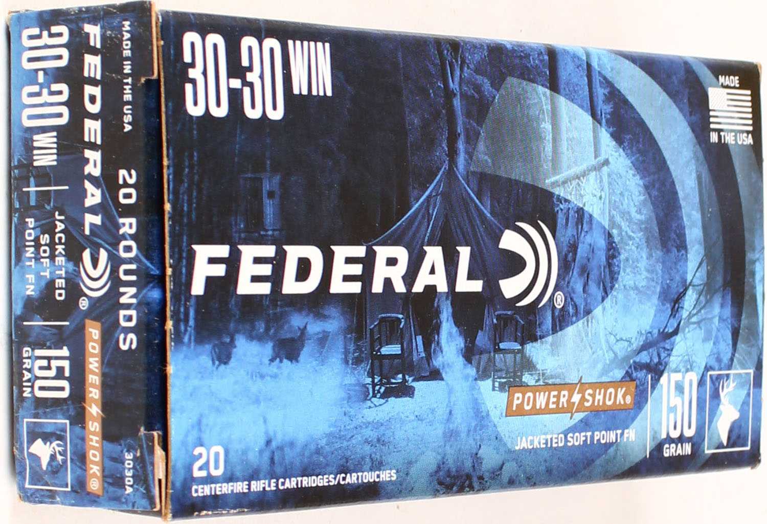 Federal, Power Shok, 30-30 Win, 150 Grain Jacketed Soft Point FN, Full, 1pc. multi-colored box, box is solid with excellent color, Ammo is excellent. Grade: Excellent ++ - Value: 20 to 80
