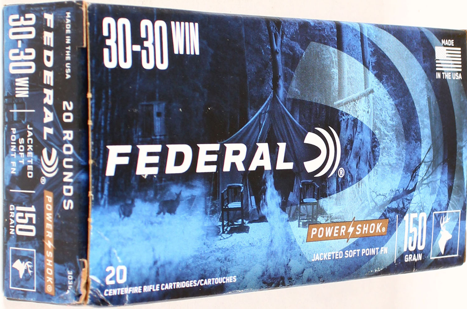Federal, Power Shok, 30-30 Win, 150 Grain Jacketed Soft Point FN, Full, 1pc. multi-colored box, box is solid with excellent color, Ammo is excellent. Grade: Excellent ++ - Value: 20 to 80