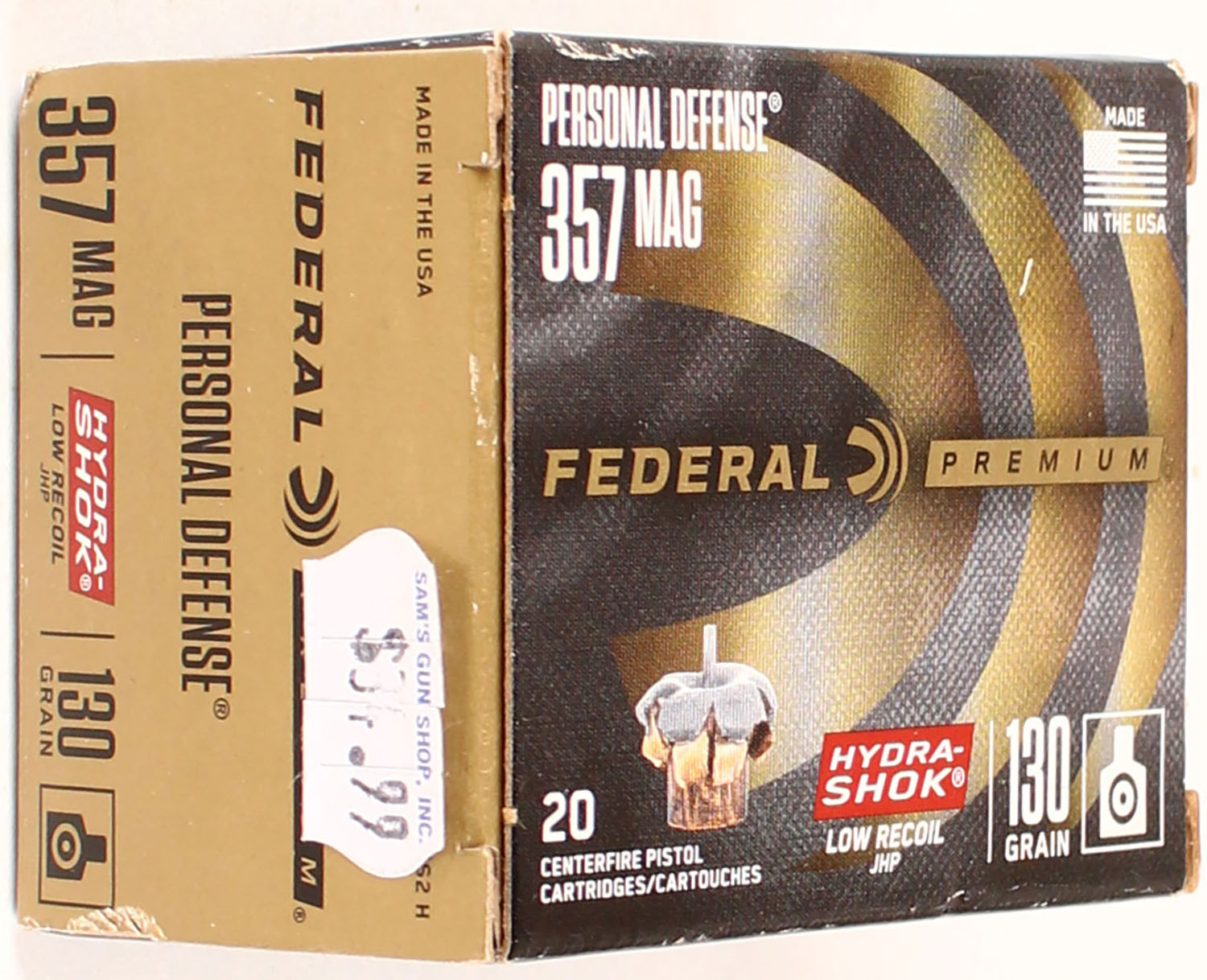 Federal Premium, Personal Defense, 357 Mag, 130 Grain Hydra-Shok JHP, Full, 1pc. multi-colored box, box is solid with excellent color, Ammo is excellent. Grade: Excellent + - Value: 20 to 80
