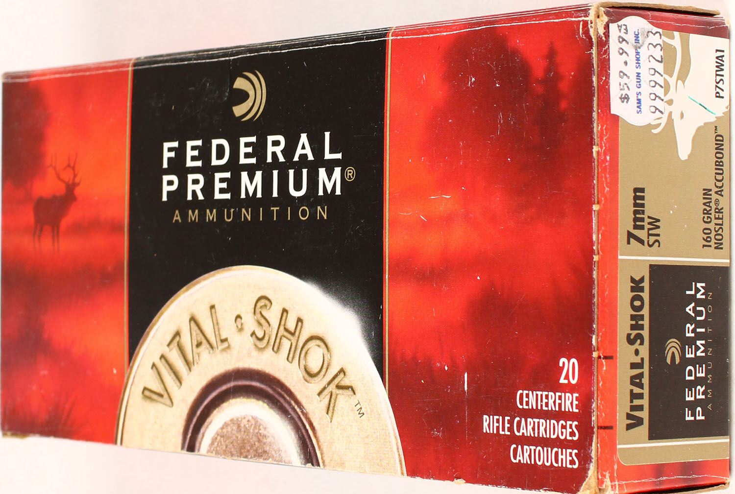 Federal Premium, Vital-Shok, 7mm STW, 160 Grain Nosler Accubond, Full, 1pc. multi-colored box, box is solid with excellent color, Ammo is excellent. Grade: Excellent ++ - Value: 20 to 80