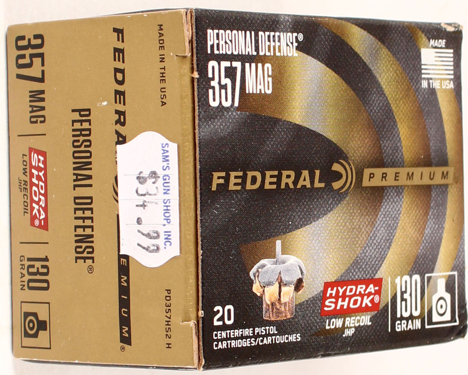 Federal Premium, Personal Defense, 357 Mag, 130 Grain Hydra-Shok JHP, Full, 1pc. multi-colored box, box is solid with excellent color, Ammo is excellent. Grade: Excellent ++ - Value: 20 to 80