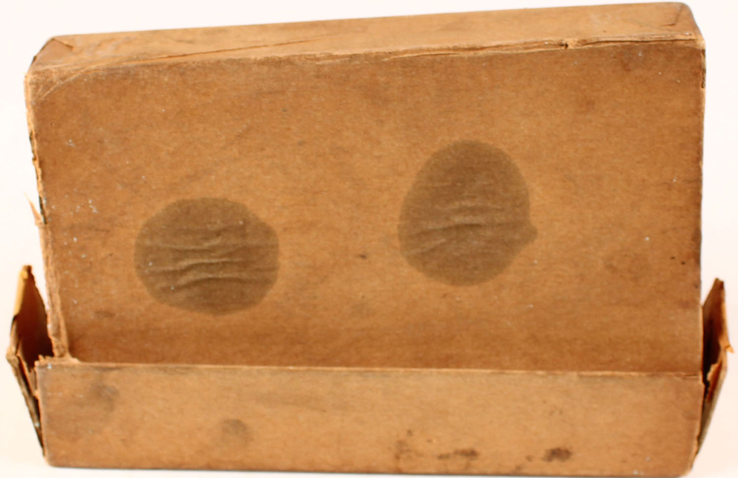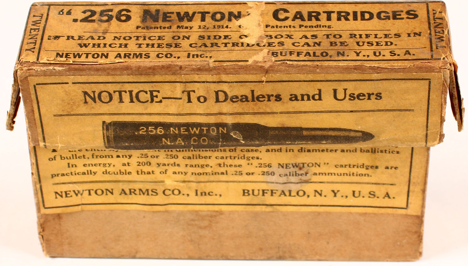 Newton Arms Co., 256. Newton, 129 Grain Heat-Insulated Protected Soft-Point Bullet, Partial 3rds. 2pc. Buff box with yellow labels, box is solid with very good color, age soiling, shelf wear, vertical seam splits to all corners of lid, corner wear, minor edge wear, staining to back, labels are intact, ammo is very good. Grade; Good ++ - Value: 8 to 40