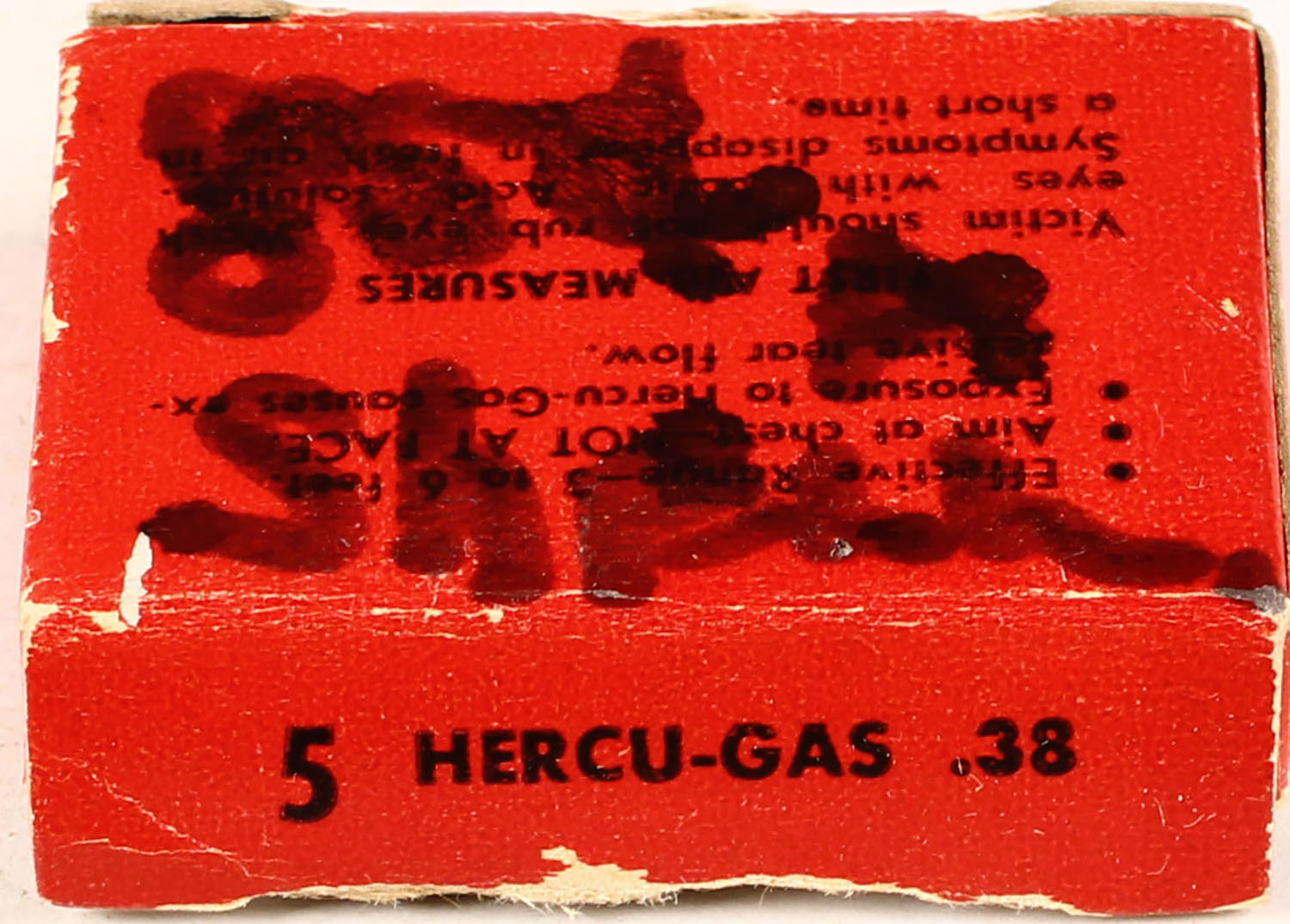 Hercules Gas-Munitions Corp, .38 Special Hercu-Gas (Tear Gas) Cartridges, Full 5rds, 1pc. Red box, box is solid with excellent color, edge & corner wear, bottom has been written on, no insert tab on back end flap, ammo is very good to excellent. Grade: Excellent - Value: 10 to 50