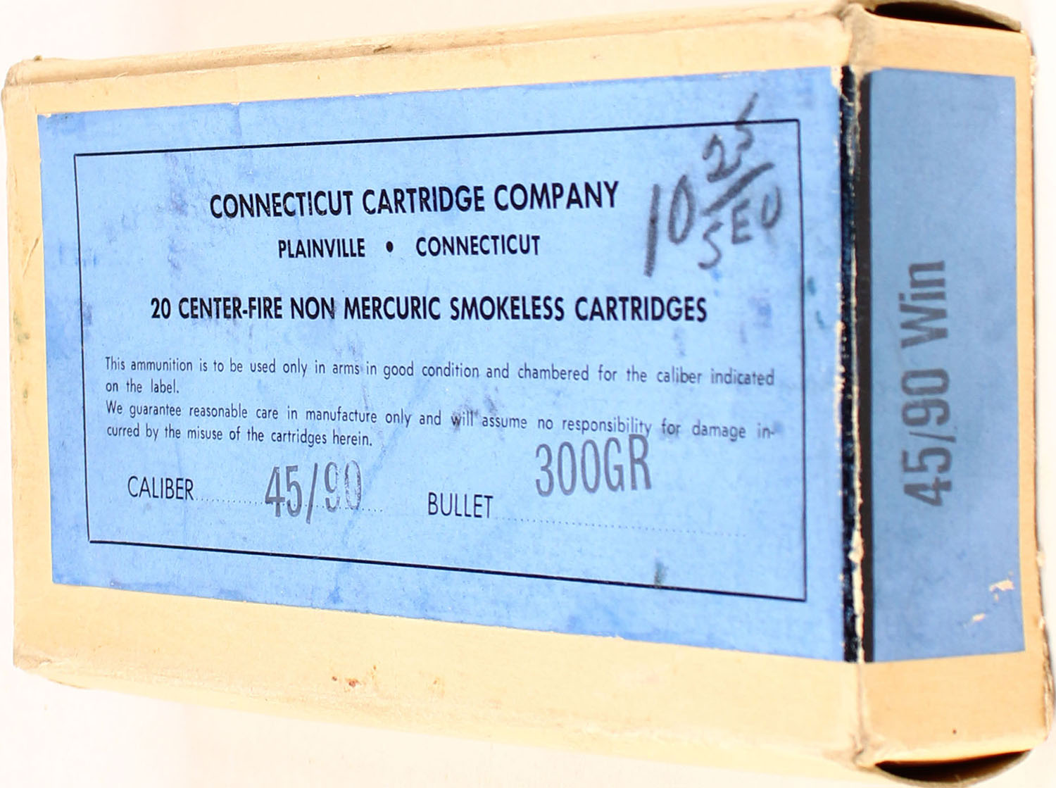 Connecticut Cartridge Co., 45-90, 300 Gr., Full, 1pc. Buff box with blue label, box is solid with excellent color, very minor age soiling, front has been written on, some shelf & corner wear, very minor corner wear, top flap is solid, ammo is excellent. Grade: Excellent + - Value: 30 to 90