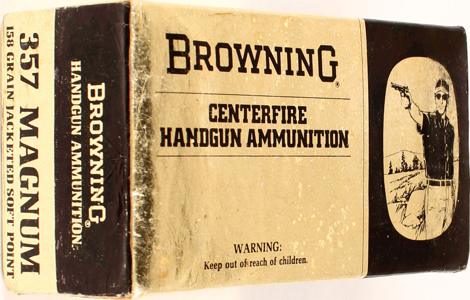 Browning, 357 Magnum, 158 Grain Jacketed Soft Point, Full, 1pc. multi-colored box, box is solid with excellent color, light shelf wear, Ammo is excellent. Grade: Excellent - Value: 40 to 120