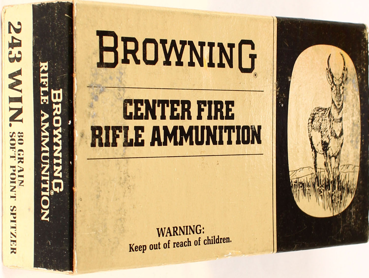 Browning, 243 Win, 80 Grain Soft Point Spitzer, Full, 1pc. multi-colored box, box is solid with excellent color, has shelf wear, tape damage on top, back, & bottom, Ammo is excellent. Grade: Excellent - Value: 40 to 120