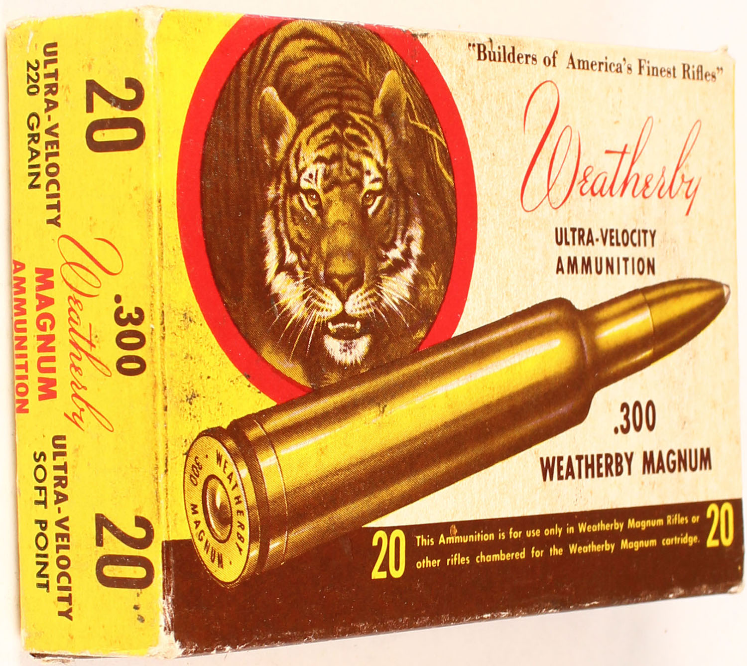 Weatherby, 300 W.M., 220 Grain Ultra-Velocity Soft Point, Full with 19 being correct, 1pc. multi-colored box, box is solid with excellent color, light soiling, Ammo is excellent. Grade: Excellent + - Value: 20 to 80