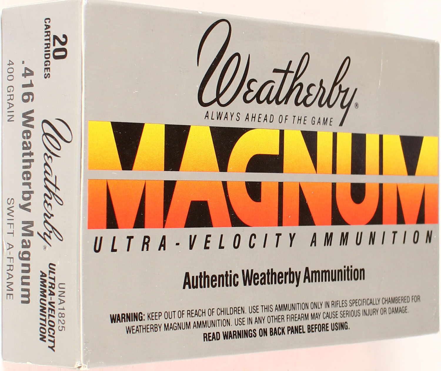 Weatherby, 416 W.M., 400 Grain Ultra-Velocity Swift A-Frame, Full, 1pc. multi-colored box, box is solid with excellent color, Ammo is excellent. Grade: Excellent ++ - Value: 20 to 80