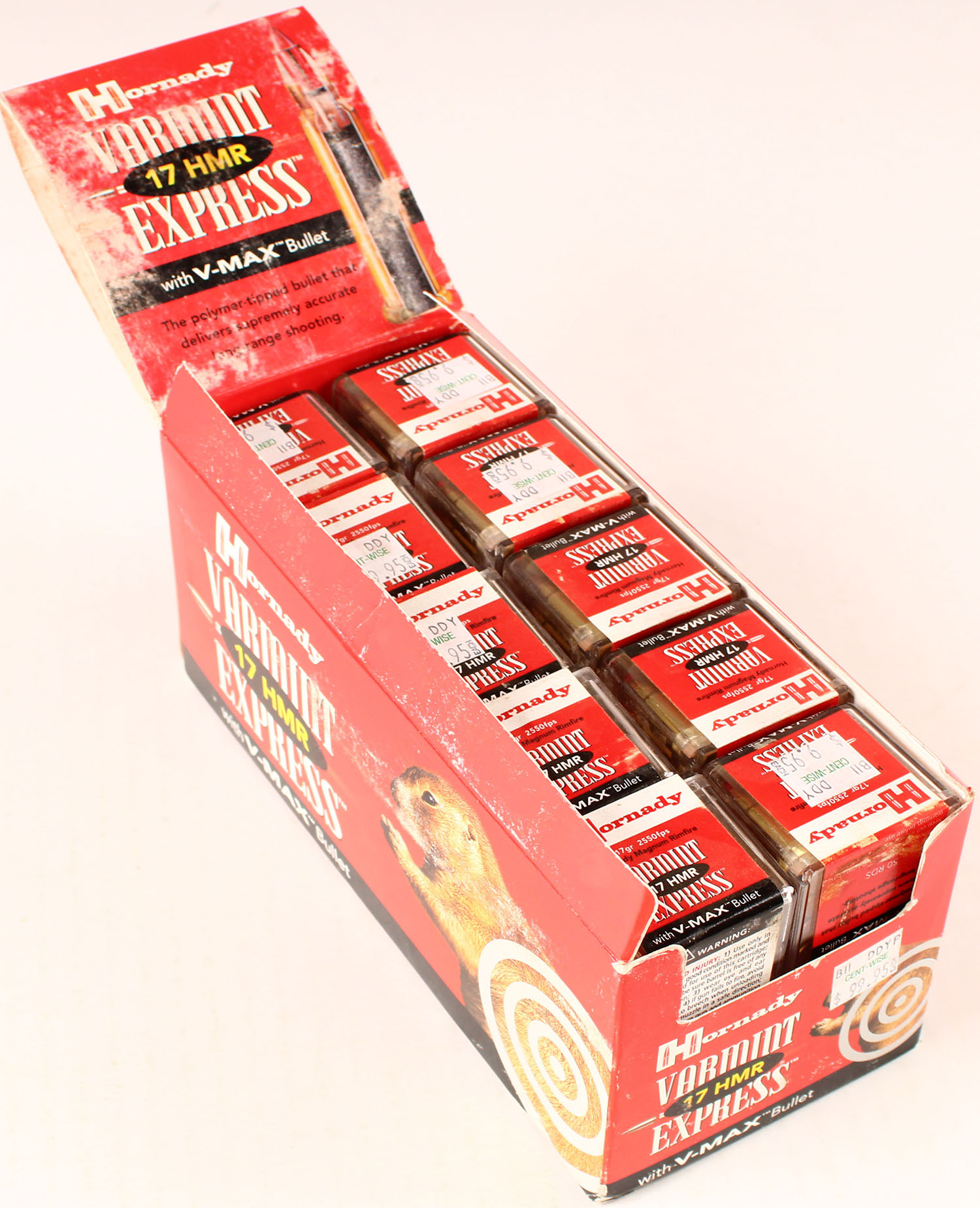 Hornady, 17 HMR, 17 Grain Varmint Express, Full brick of 10 boxes, 1pc. multi-colored box, box is solid with very nice color & shelf wear, Ammo is excellent. Grade: Excellent - Value: 40 to 120