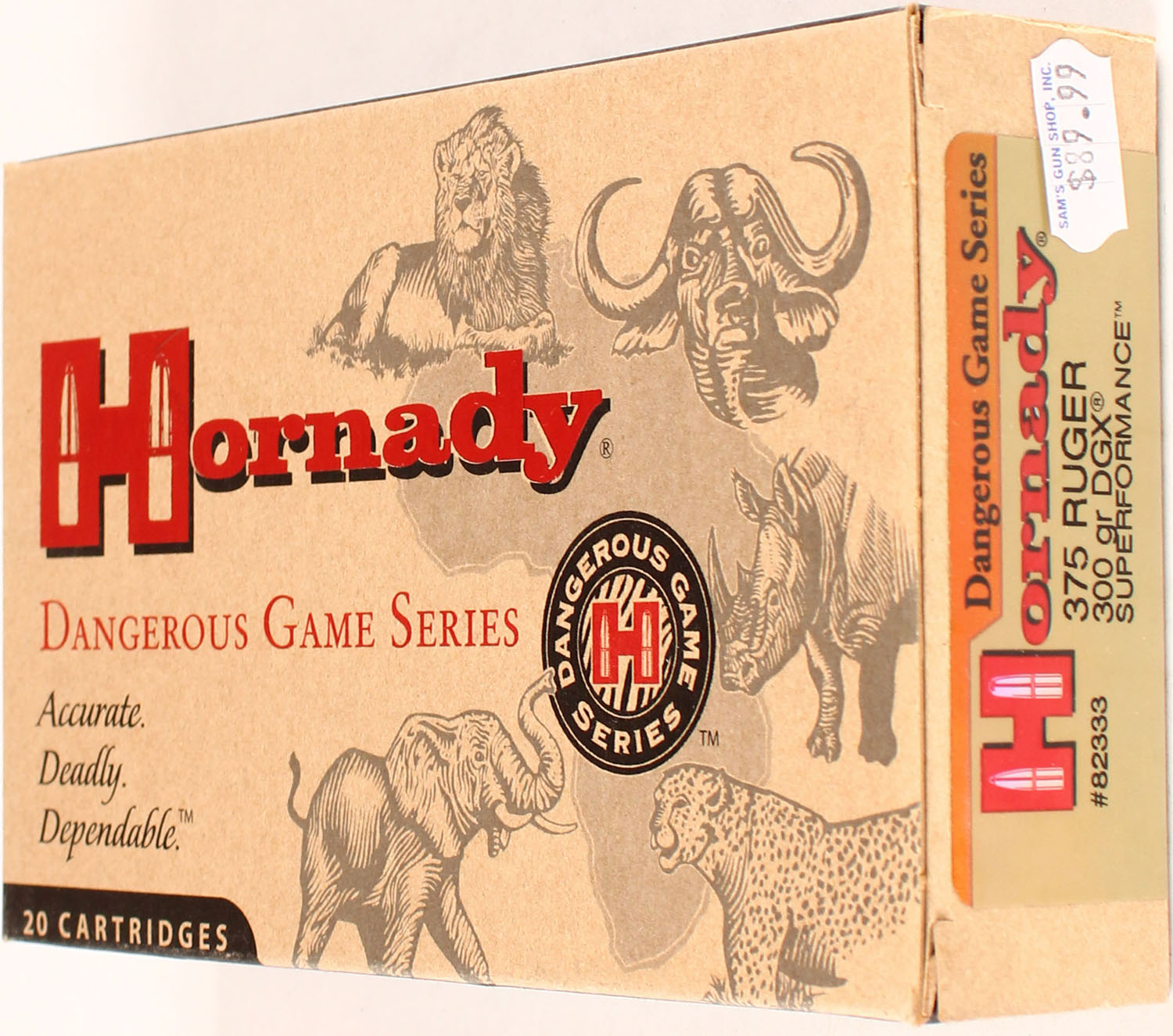 Hornady, 375 Ruger, 300 Grain DGX Superformance, Full, 1pc. multi-colored box, box is solid with excellent color, Ammo is excellent. Grade: Excellent ++ - Value: 20 to 80