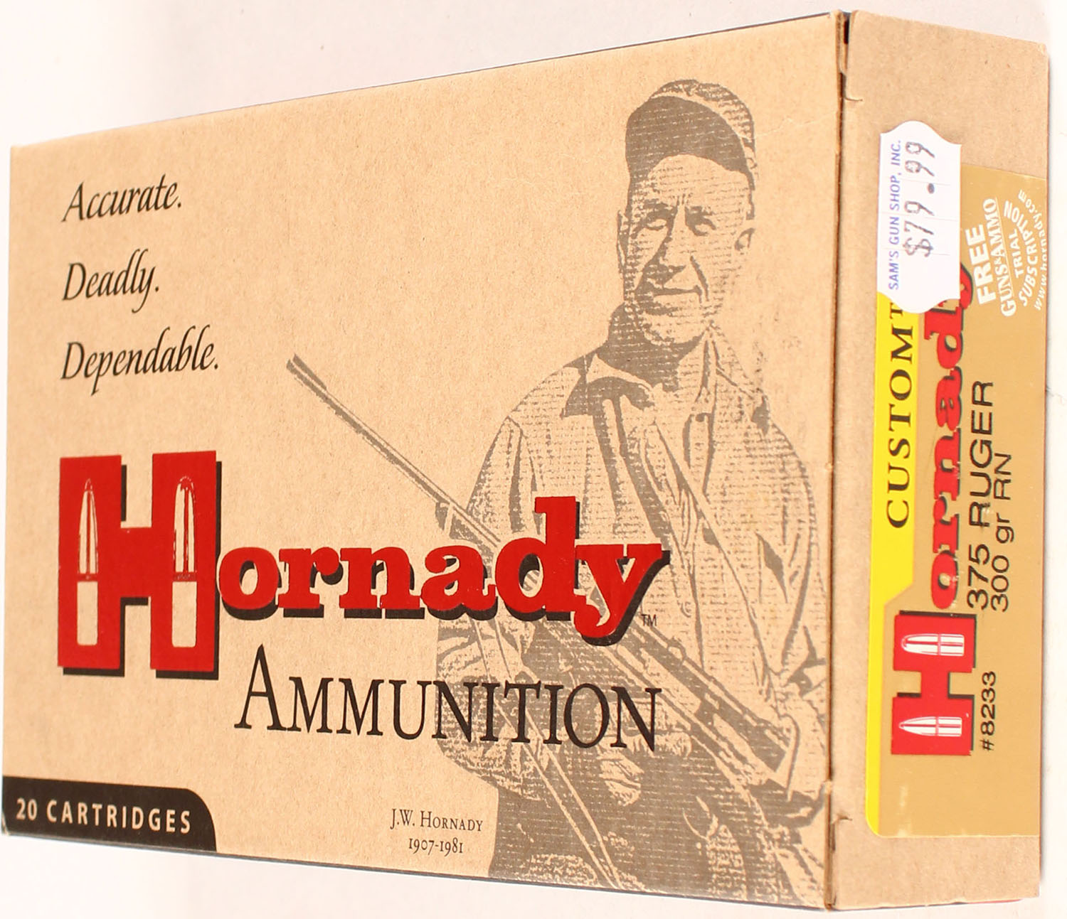 Hornady, 375 Ruger, 300 Grain RN, Full, 1pc. multi-colored box, box is solid with excellent color, Ammo is excellent. Grade: Excellent ++ - Value: 20 to 80