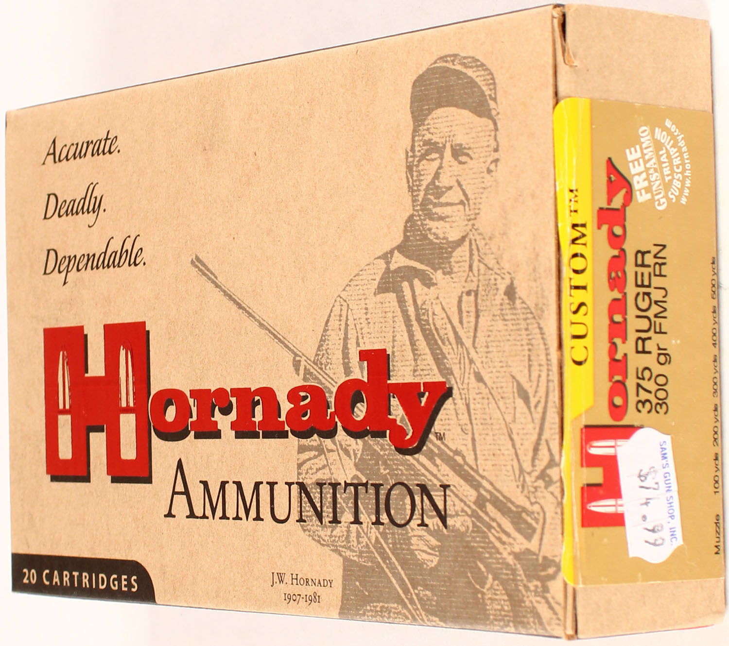 Hornady, 375 Ruger, 300 Grain FMJ RN, Full, 1pc. multi-colored box, box is solid with excellent color, Ammo is excellent. Grade: Excellent ++ - Value: 20 to 80
