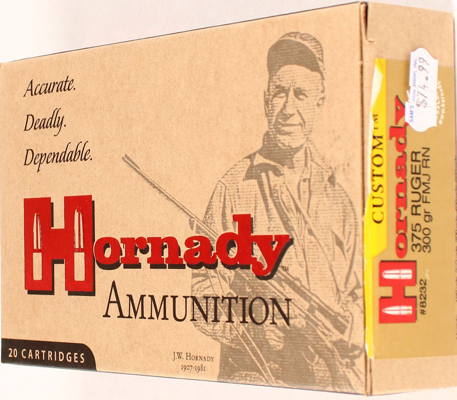 Hornady, 375 Ruger, 300 Grain FMJ RN, Full, 1pc. multi-colored box, box is solid with excellent color, Ammo is excellent. Grade: Excellent ++ - Value: 20 to 80