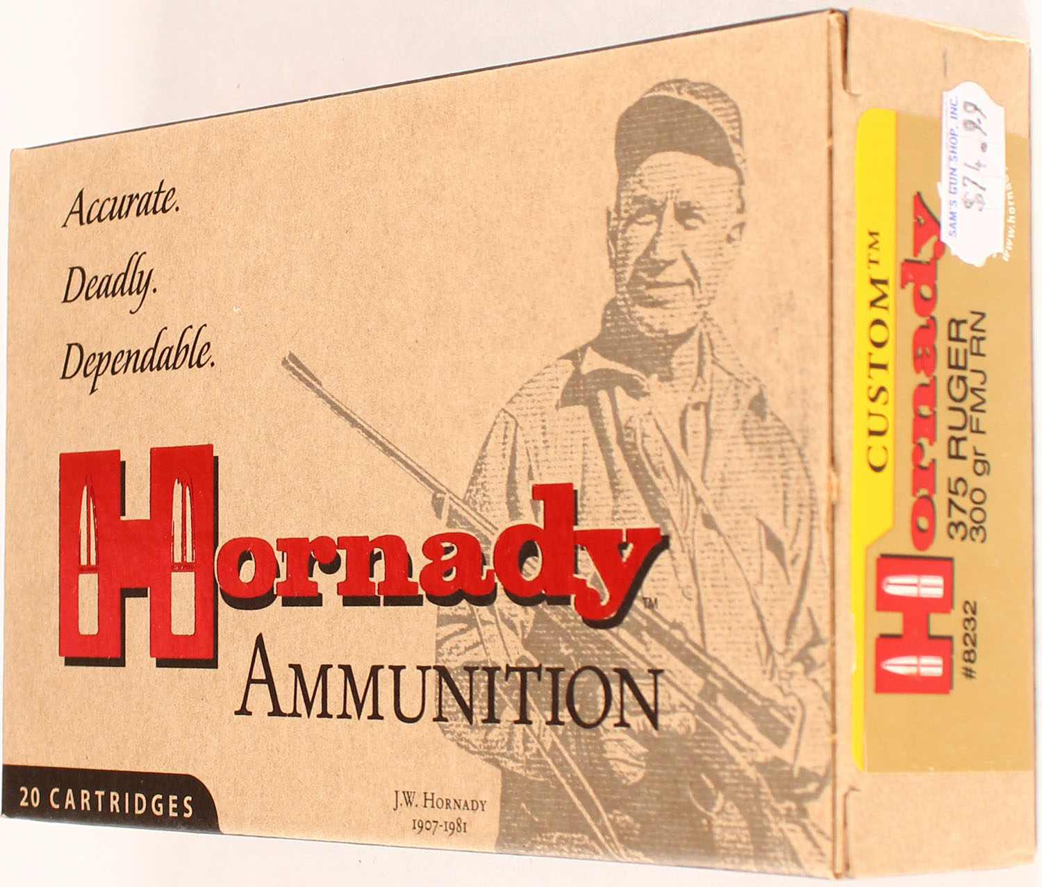 Hornady, 375 Ruger, 300 Grain FMJ RN, Full, 1pc. multi-colored box, box is solid with excellent color, Ammo is excellent. Grade: Excellent ++ - Value: 20 to 80