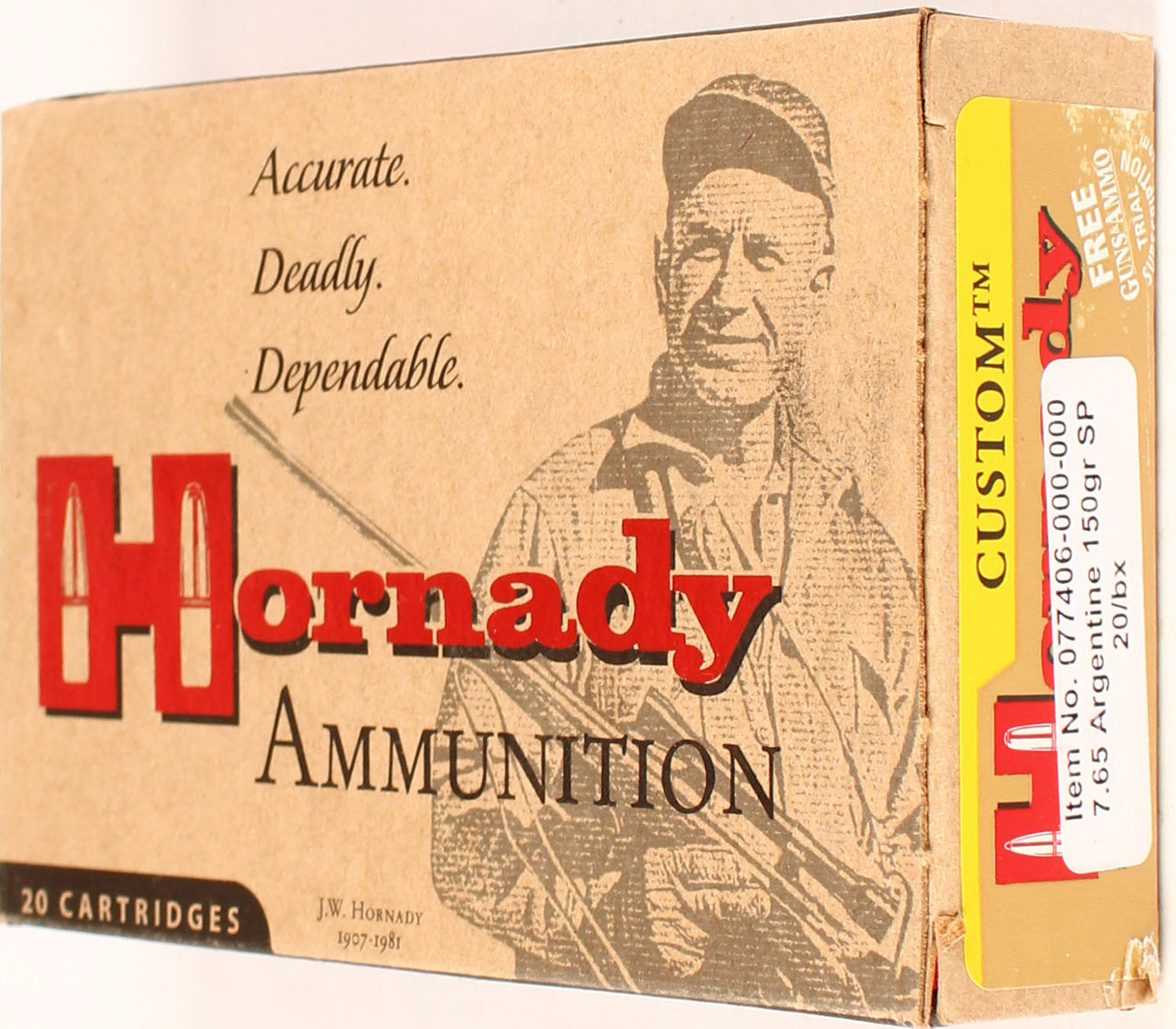 Hornady, 7.65 Argentine, 150 Grain SP, Full, 1pc. multi-colored box, box is solid with excellent color, Ammo is excellent. Grade: Excellent ++ - Value: 20 to 80