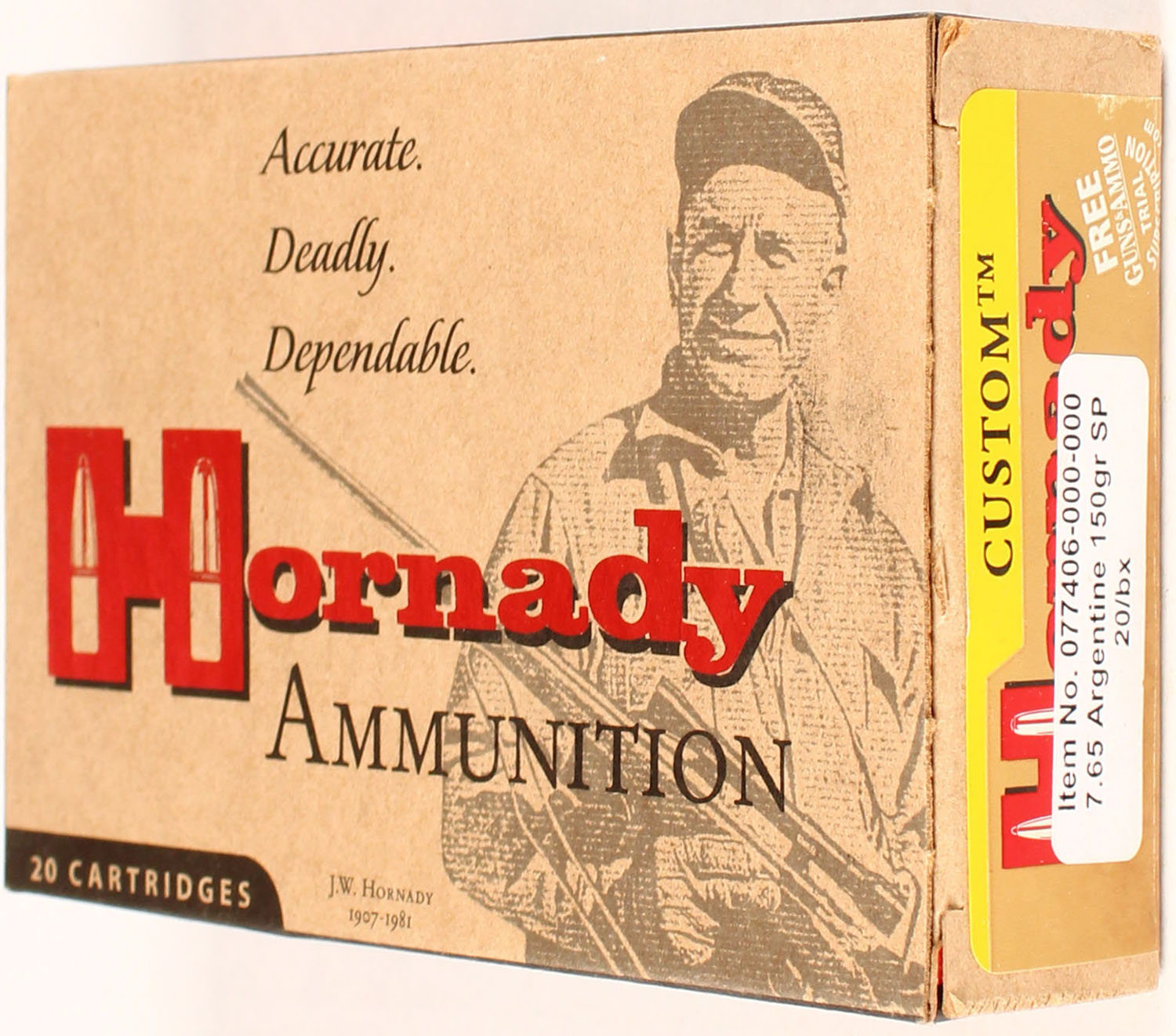Hornady, 7.65 Argentine, 150 Grain SP, Full, 1pc. multi-colored box, box is solid with excellent color, Ammo is excellent. Grade: Excellent ++ - Value: 20 to 80